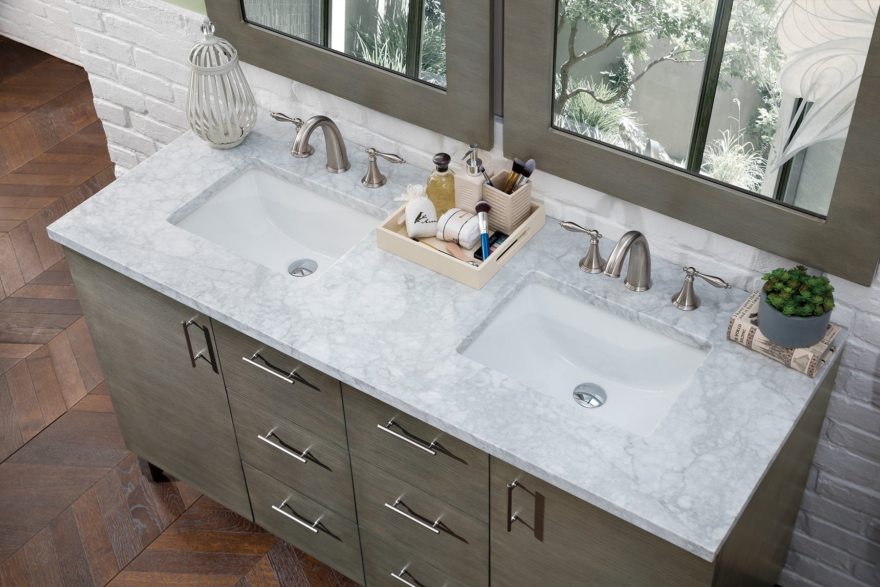 The Metropolitan 60" Silver Oak Double Vanity by James Martin Vanities is a wall-mount optional cabinet with mounting brackets and removable Brushed Nickel legs. This cabinet offers ample storage space and soft-close doors and drawers. The look is completed with a 3 CM eased edge Carrara Marble top and one white ceramic rectangular sink.
