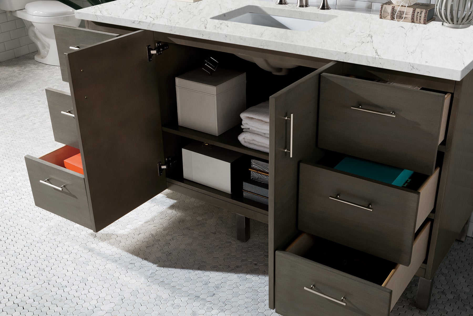 The Metropolitan 60" Silver Oak Single Vanity by James Martin Vanities is a wall-mount optional cabinet with mounting brackets and removable Brushed Nickel legs. This cabinet offers ample storage space and soft-close doors and drawers. The look is completed with a 3 CM eased edge Eternal Jasmine Pearl Silestone top and one white ceramic rectangular sink.