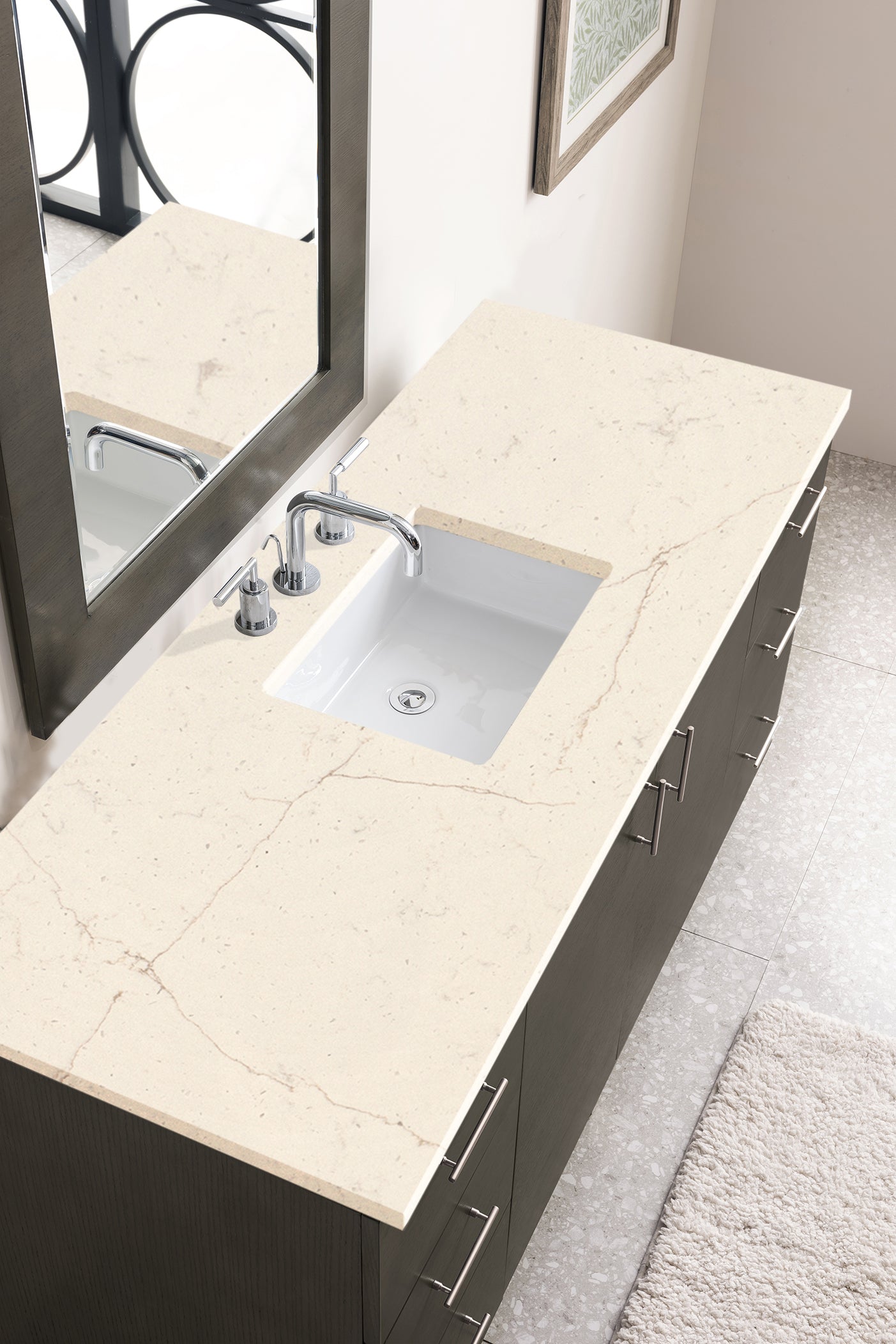 The Metropolitan 60" Silver Oak Single Vanity by James Martin Vanities is a wall-mount optional cabinet with mounting brackets and removable Brushed Nickel legs. This cabinet offers ample storage space and soft-close doors and drawers. The look is completed with a 3 CM eased edge Eternal Marfil Silestone top and one white ceramic rectangular sink.