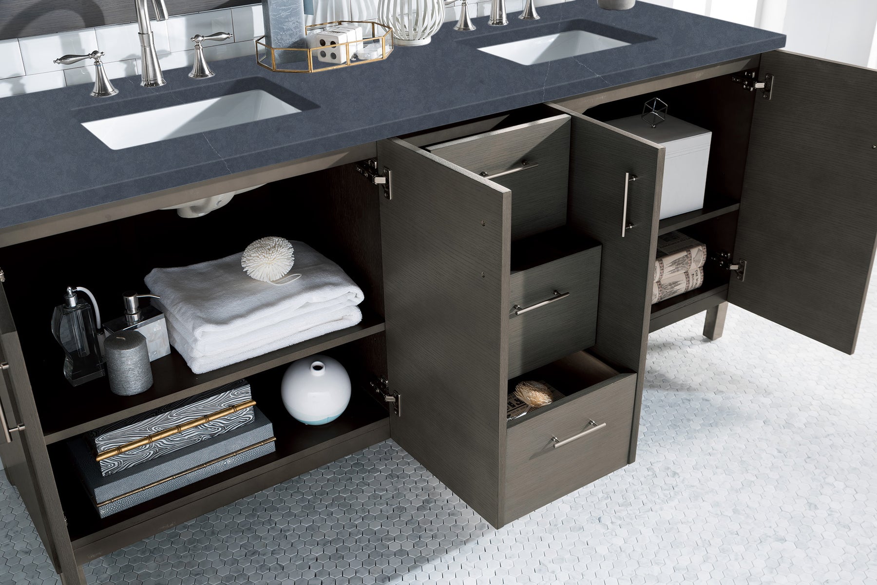 The Metropolitan 72" Silver Oak Double Vanity by James Martin Vanities is a wall-mount optional cabinet with mounting brackets and removable Brushed Nickel legs. This cabinet offers ample storage space and soft-close doors and drawers. The look is completed with a 3 CM eased edge Charcoal Soapstone Silestone top and one white ceramic rectangular sink.