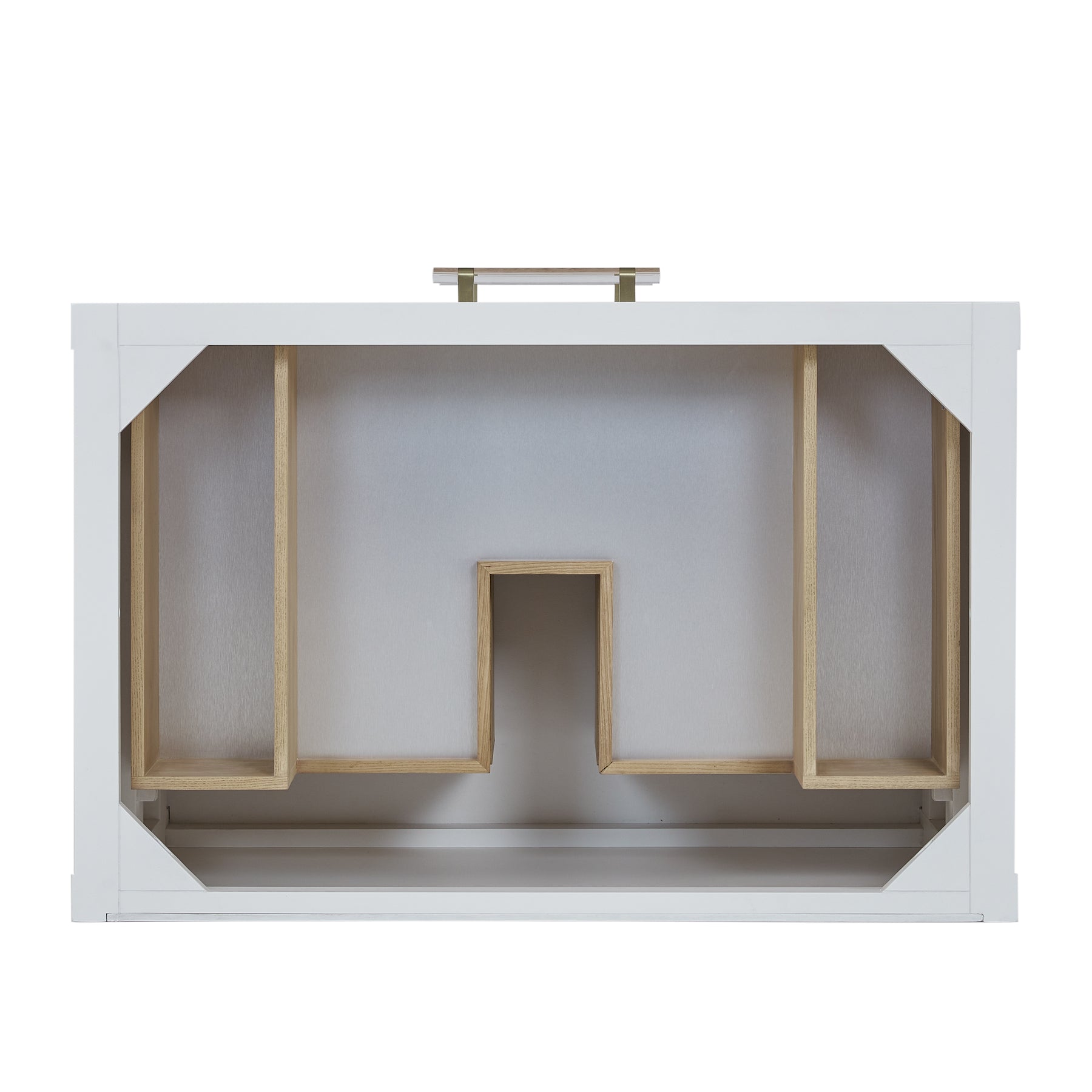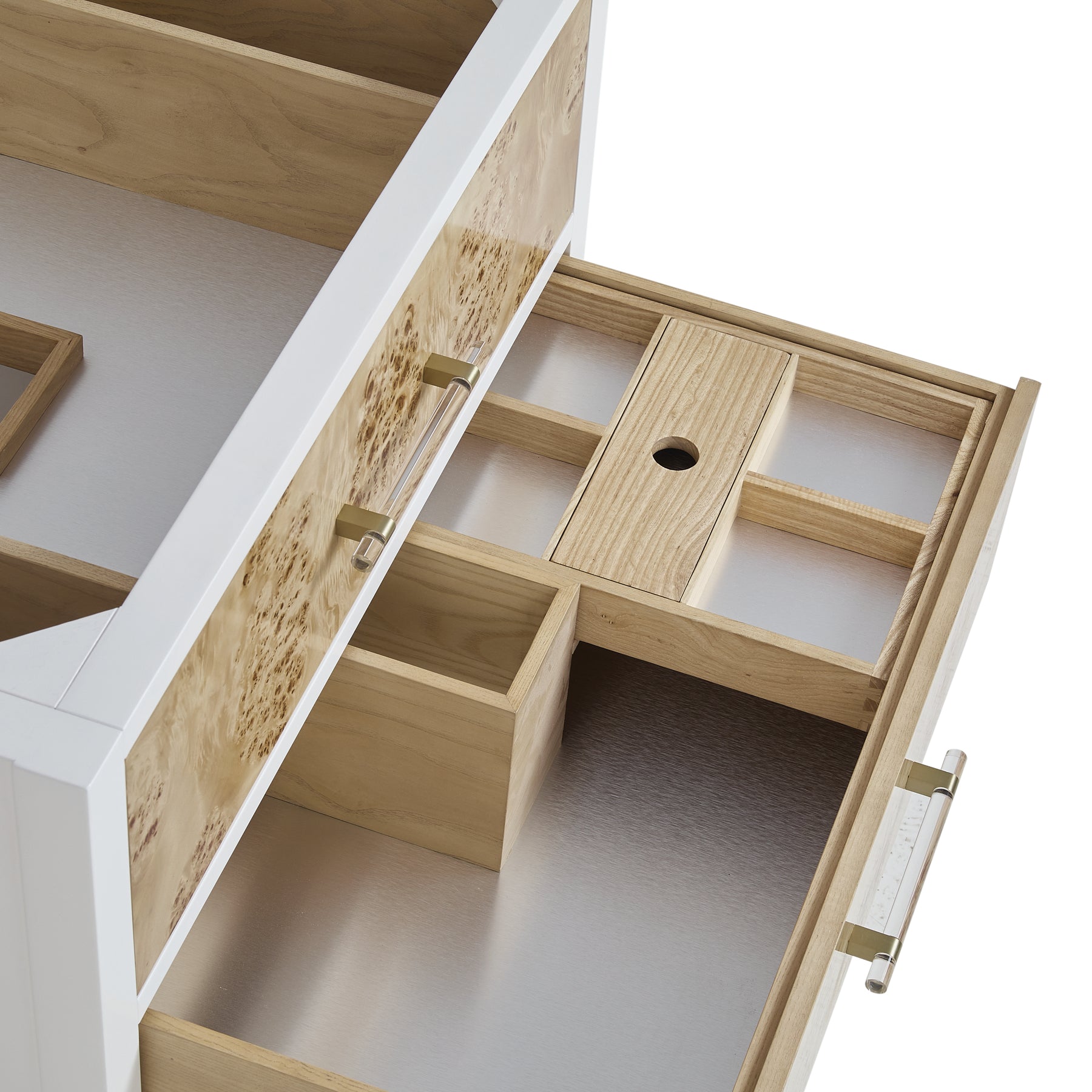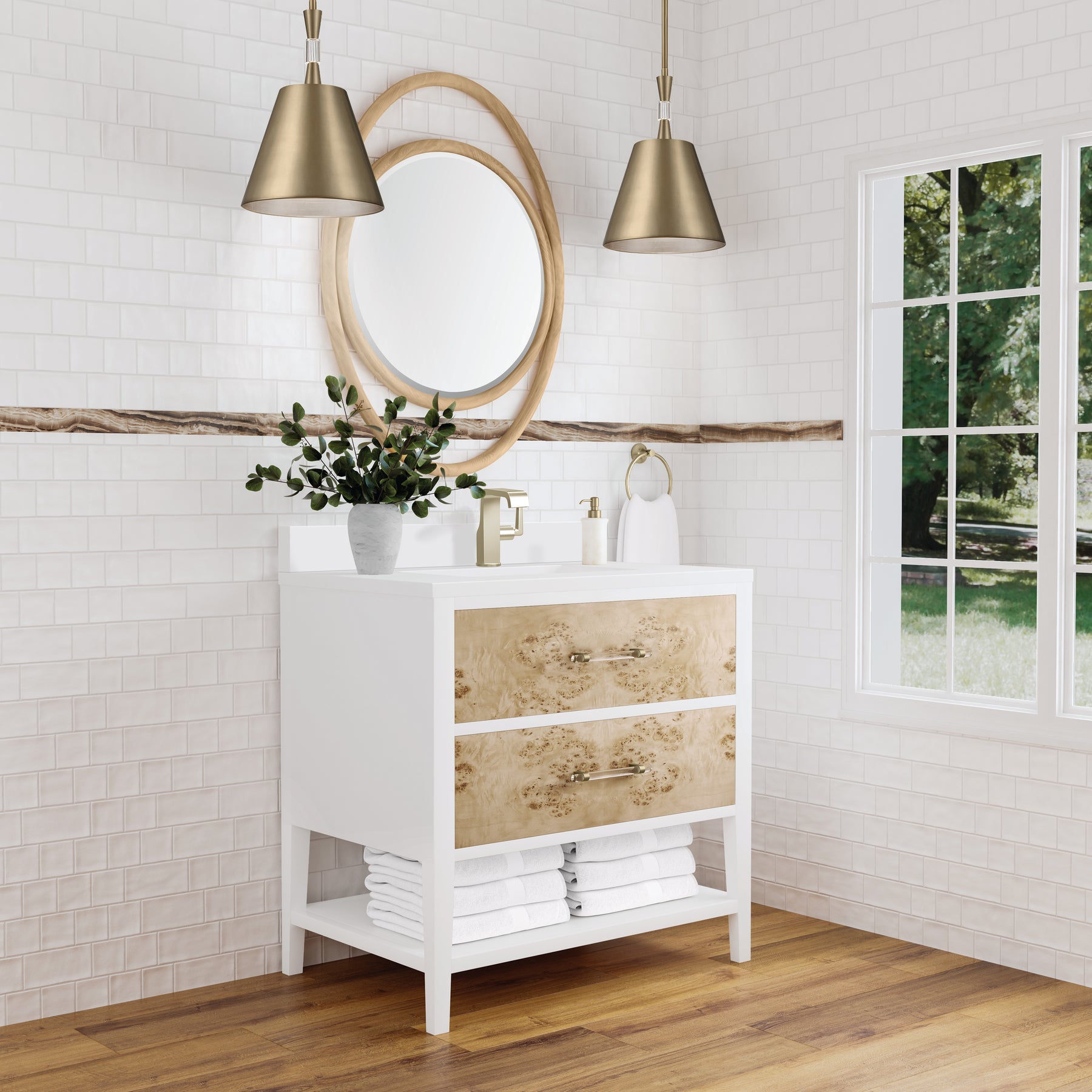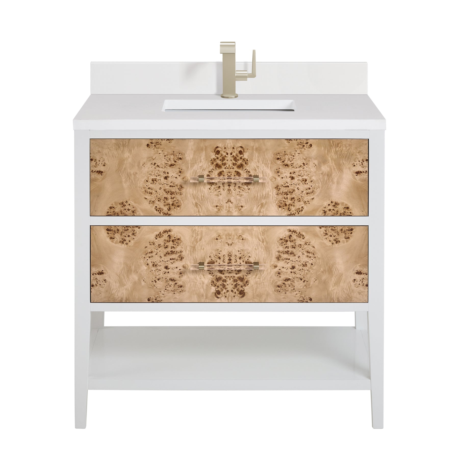 Indulge in the artistry of the Olena 36” single vanity — where craftsmanship meets the natural beauty of Mappa Burl. Each detail has been thoughtfully curated for style and functionality. This vanity boasts ample storage with two drawers and an integrated lower shelf. The acrylic and brass pulls accentuate the beauty of the Burl drawers. A pristine White Zeus Silestone top and backsplash by Cosentino with undermount rectangular sinks complete this striking piece. Vanity top is pre-drilled for a single hole faucet. Faucet not included.