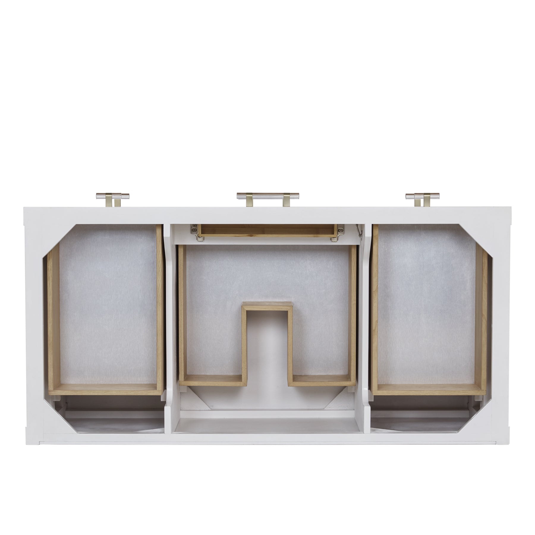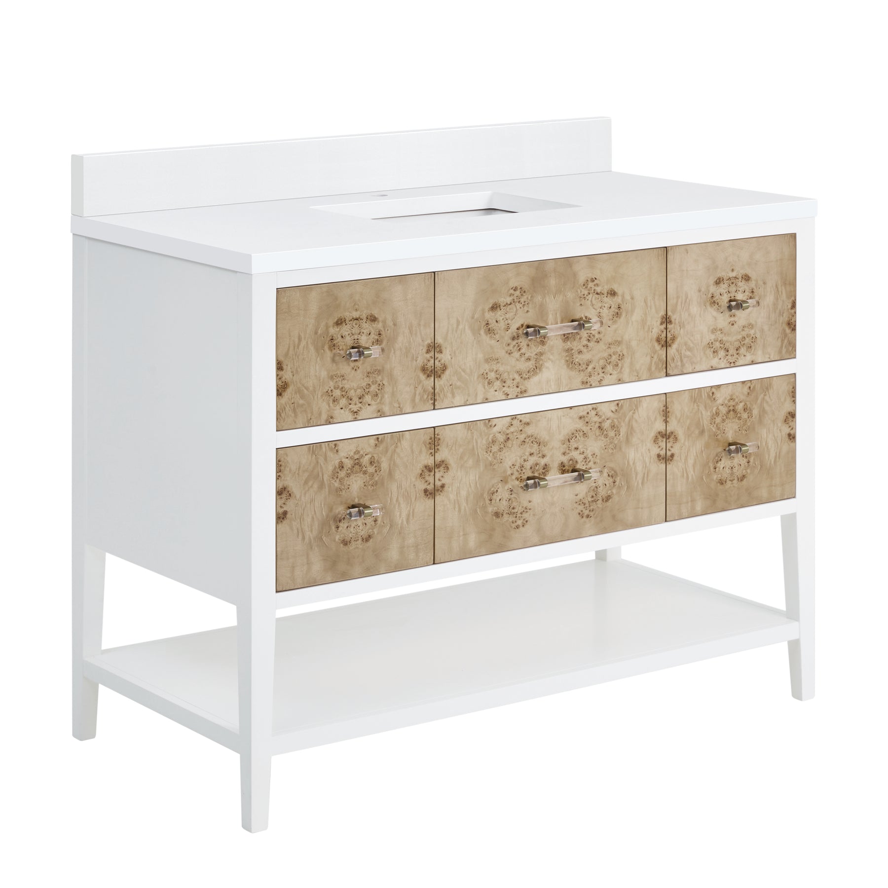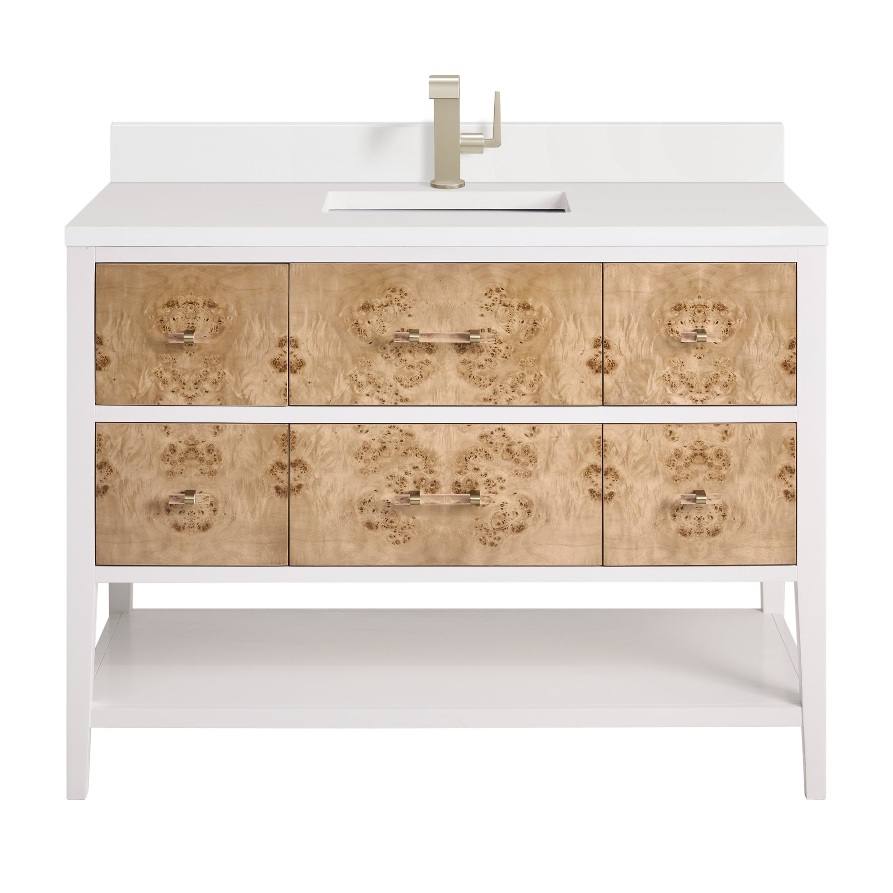 Indulge in the artistry of the Olena 48” single vanity — where craftsmanship meets the natural beauty of Mappa Burl. Each detail has been thoughtfully curated for style and functionality. This vanity boasts ample storage with one tip-out, five drawers, and an integrated lower shelf. The acrylic and brass pulls accentuate the beauty of the Burl drawers. A pristine White Zeus Silestone top and backsplash by Cosentino with undermount rectangular sinks complete this striking piece. Vanity top is pre-drilled for a single hole faucet. Faucet not included.