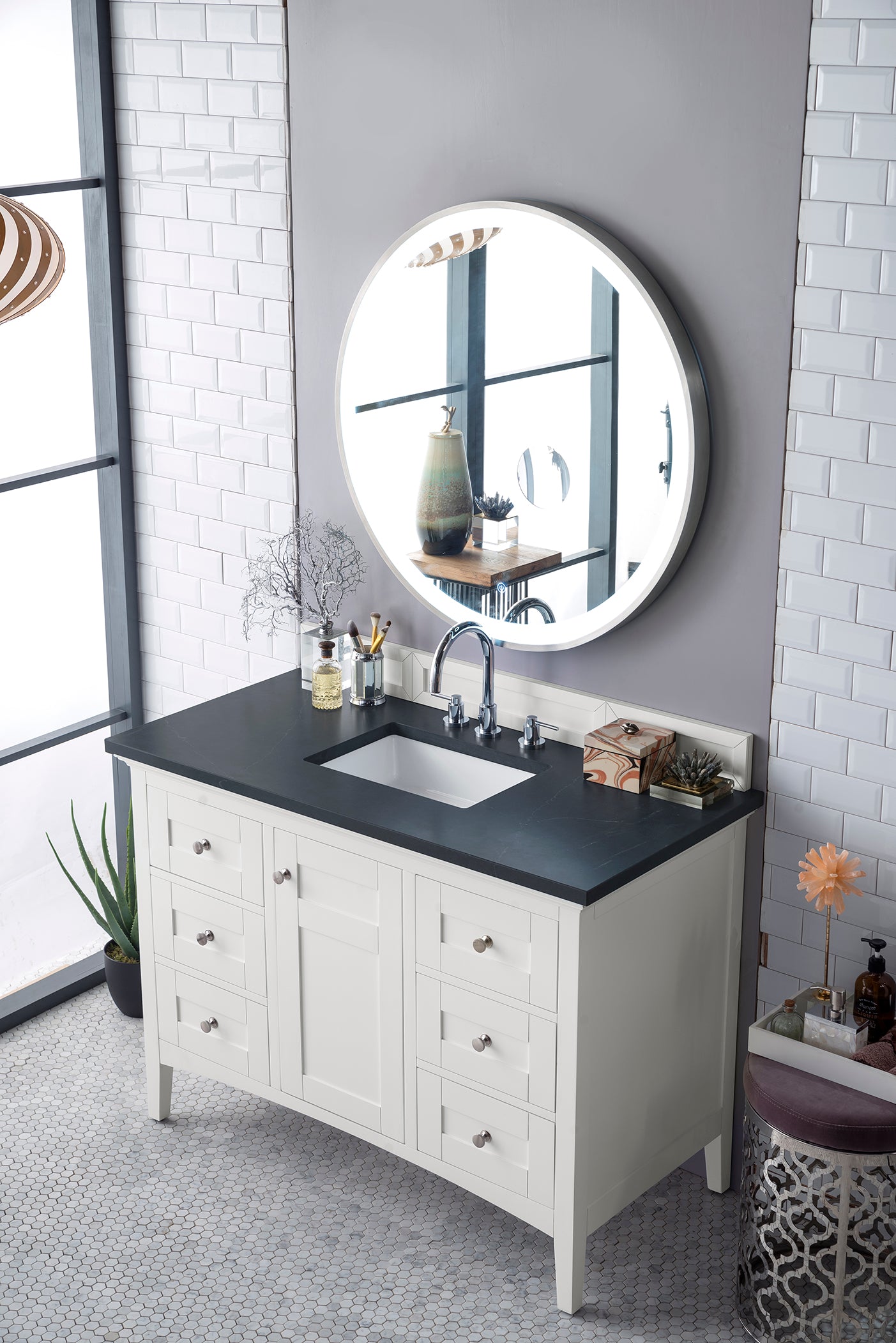 The Palisades 48" Bright White Single Vanity features one door with interior shelf space, six drawers, and tapered legs. Premium features include an electrical and USB outlet located on a custom designed shelf behind the door and a bamboo drawer organizer. Shaker made modern, Palisades was designed to lend a modern flair to traditional Shaker-style cabinets. The look is completed with a 3 CM eased edge Charcoal Soapstone Silestone top and one white ceramic rectangular sink.