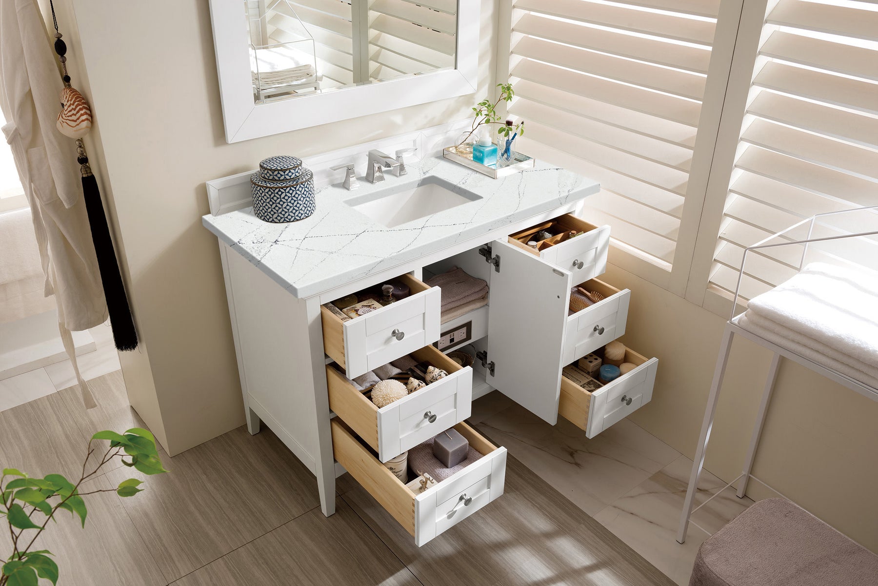 The Palisades 48" Bright White Single Vanity features one door with interior shelf space, six drawers, and tapered legs. Premium features include an electrical and USB outlet located on a custom designed shelf behind the door and a bamboo drawer organizer. Shaker made modern, Palisades was designed to lend a modern flair to traditional Shaker-style cabinets. The look is completed with a 3 CM eased edge Ethereal Noctis Silestone top and one white ceramic rectangular sink.