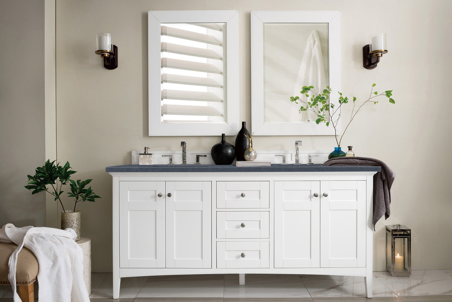 The Palisades 72" Bright White Double Vanity features four doors with two interior shelves, three drawers, and tapered legs. Premium features include an electrical and USB outlet located on a custom designed shelf behind the door and a bamboo drawer organizer. Shaker made modern, Palisades was designed to lend a modern flair to traditional Shaker-style cabinets. The look is completed with a 3 CM eased edge Charcoal Soapstone Silestone top and two white ceramic rectangular sinks.