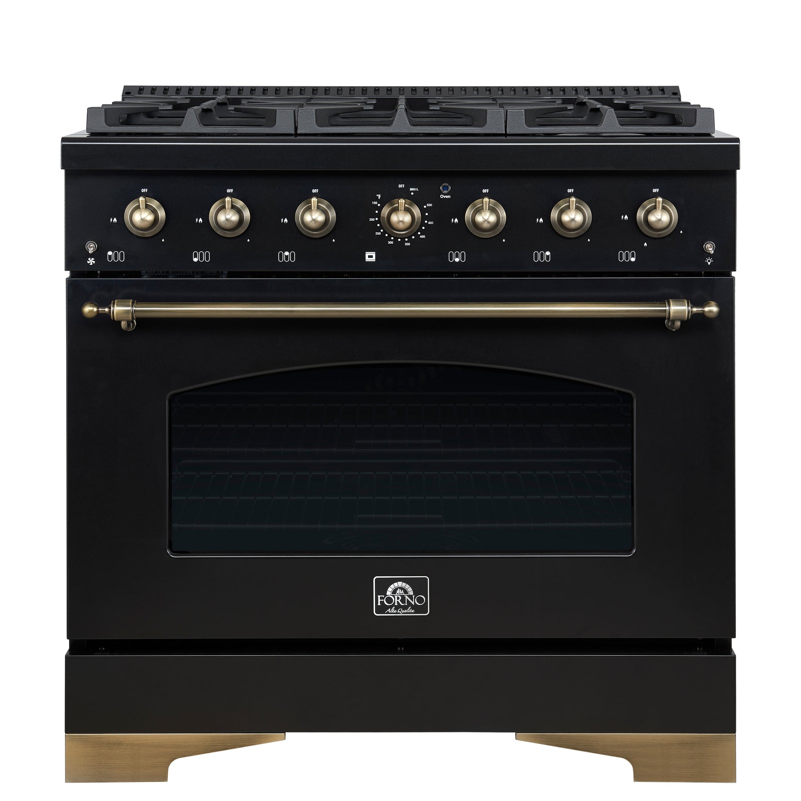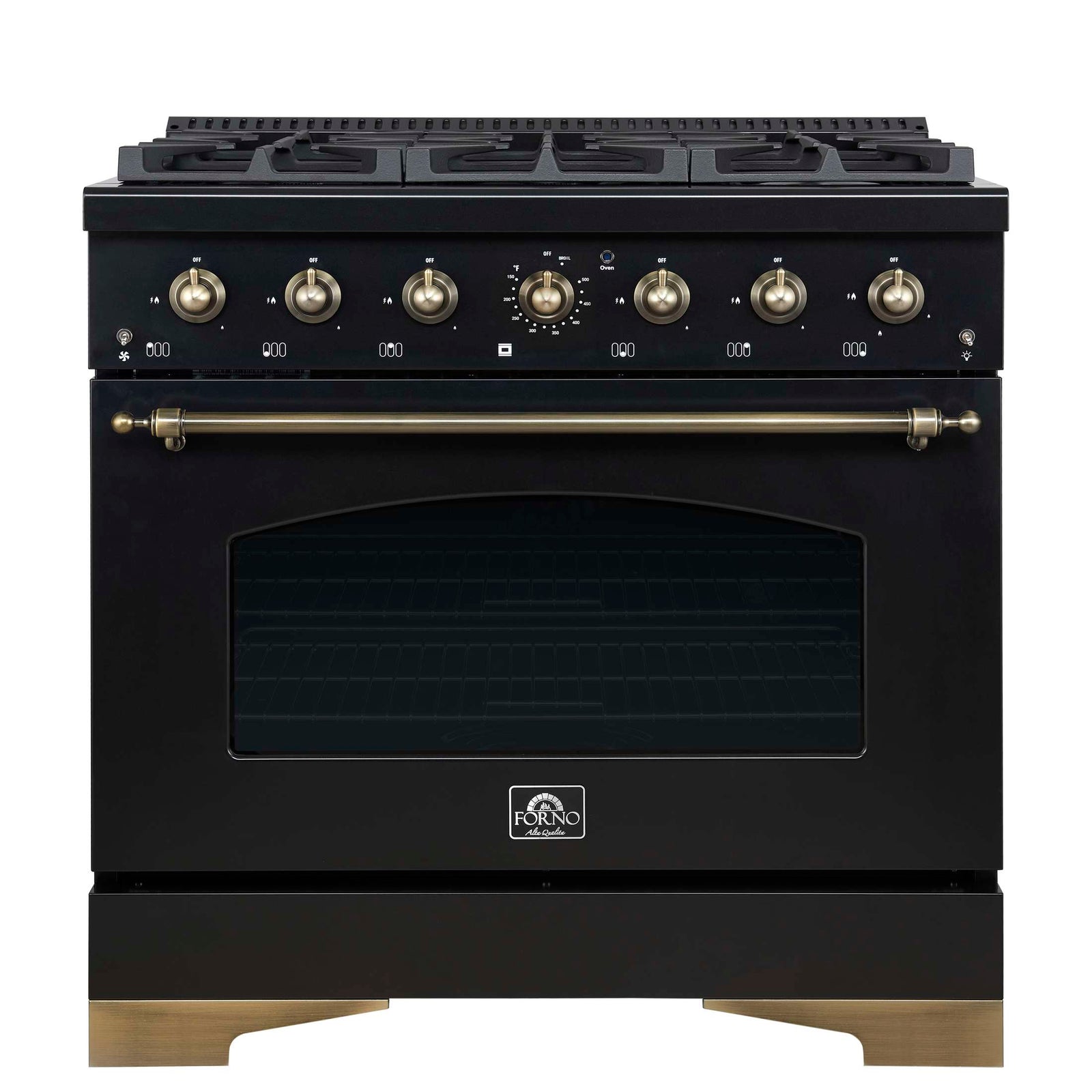 Forno Antico 36-Inch Freestanding Gas Range, Black, Antique Brass Design, 6 Burners, Convection Oven, Energy Efficient