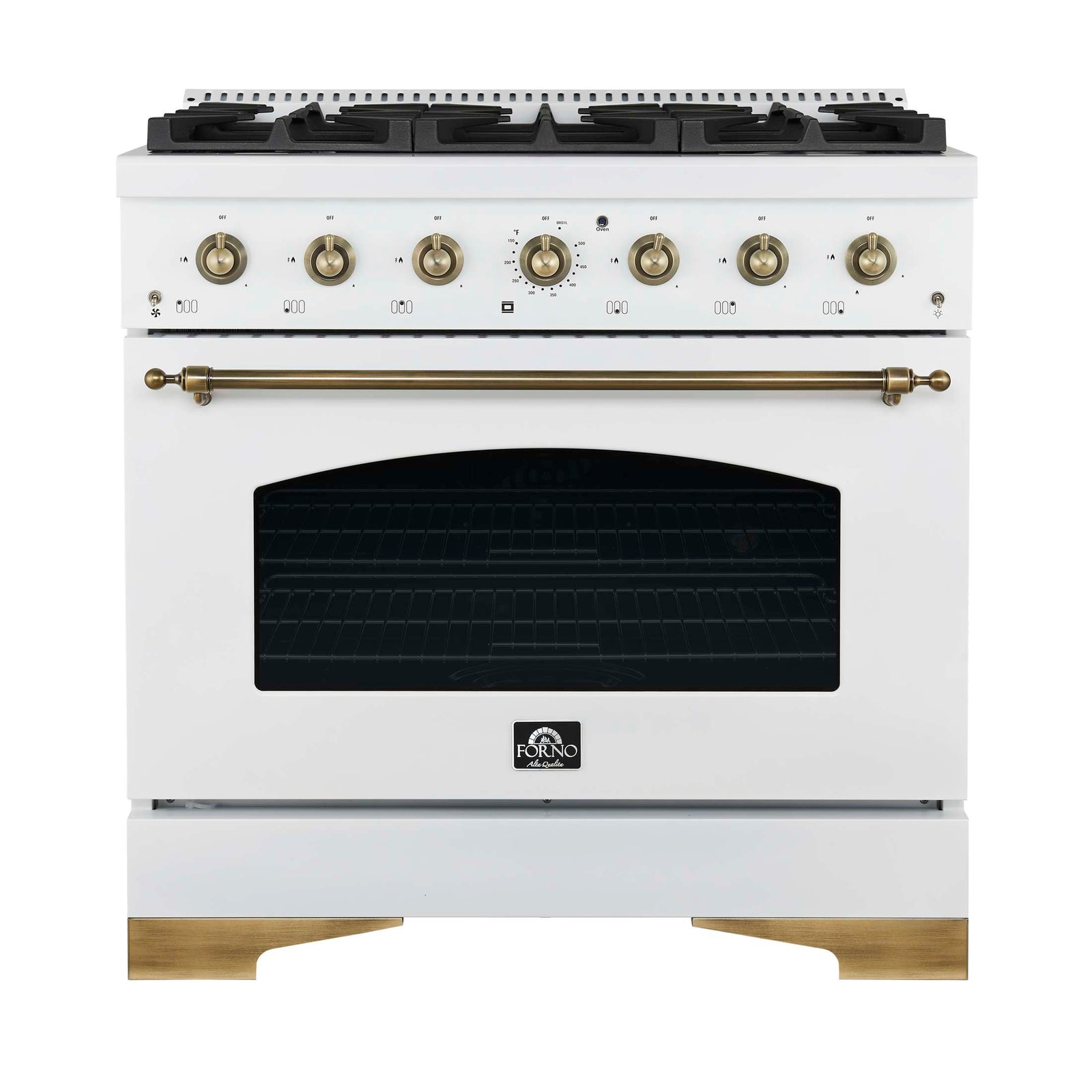 Forno Antico 36-Inch Freestanding Gas Range, White, Antique Brass Design, 6 Burners, Convection Oven, Energy Efficient