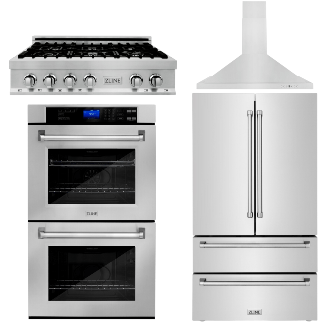 ZLINE 4-Piece Appliance Package - 36 In. Rangetop, Range Hood, Refrigerator, and Double Wall Oven in Stainless Steel, 4KPR-RTRH36-AWD