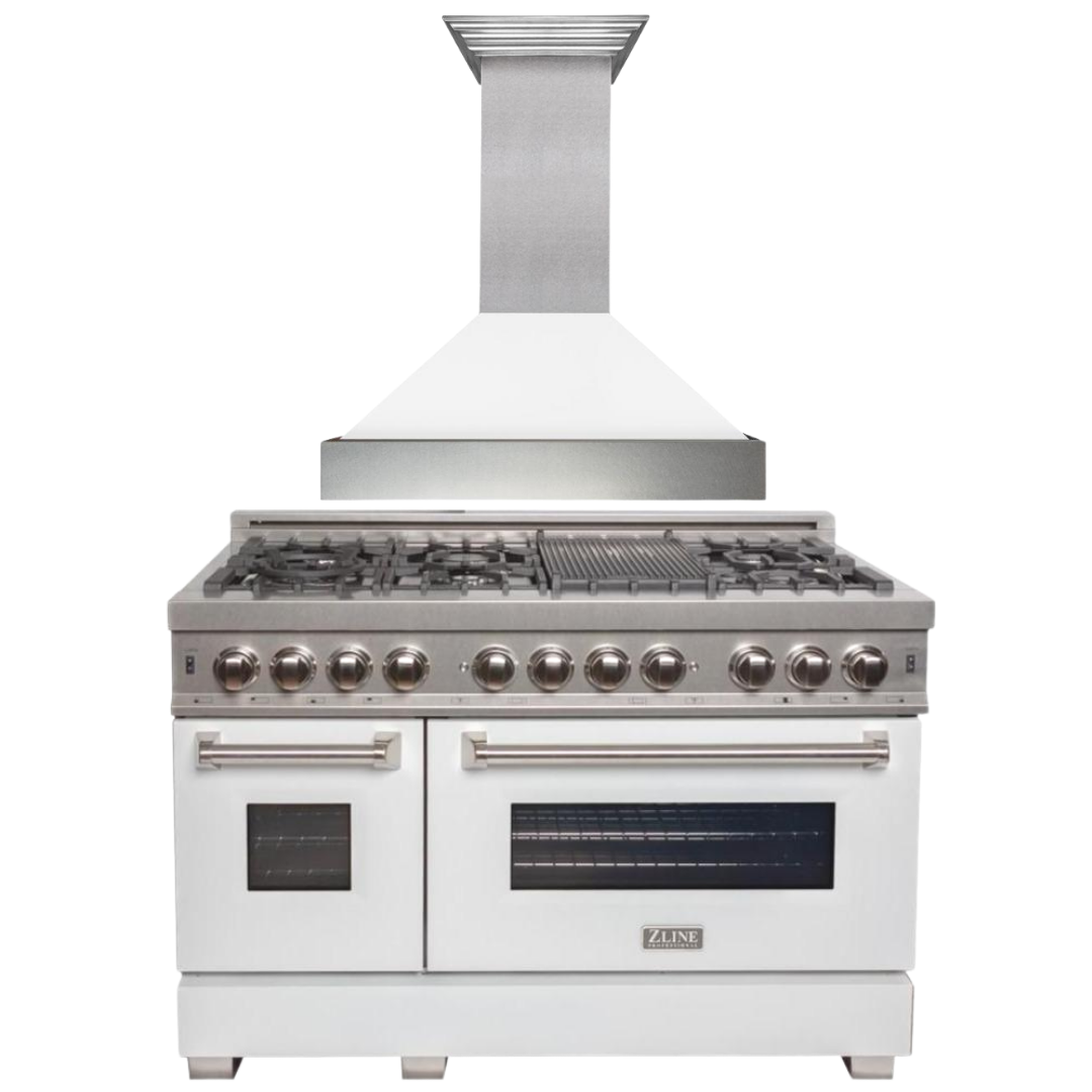 ZLINE 48" Dual Fuel Range with White Matte Gloss Door & 48" Range Hood Appliance Package, 2KP-RASWMRH48
