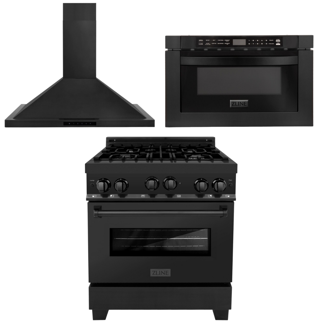 ZLINE Appliance Package - 30 In. Dual Fuel Range, Range Hood, Microwave Oven in Black Stainless Steel, 3KP-RABRHMWO-30