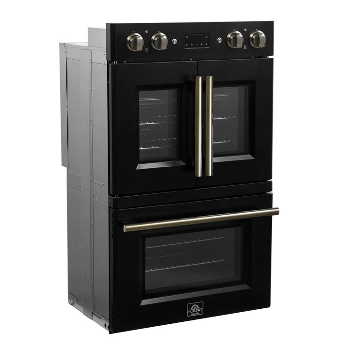 The Forno Asti 30” Double Wall Oven in black with anitque brass accessories combines elegance and performance with a French-door top oven for effortless, one-handed access. Featuring 7.36 cu. ft. of true convection cooking, it ensures even heat distribution for perfect baking results. The built-in air-fry function delivers crispy textures with minimal oil, while precision control knobs provide a hands-on approach to cooking. A digital LED display offers seamless management of the timer and Sous Vide function, enhancing precision and versatility. Designed for convenience, the self-cleaning mode simplifies maintenance, keeping your oven spotless with minimal effort.