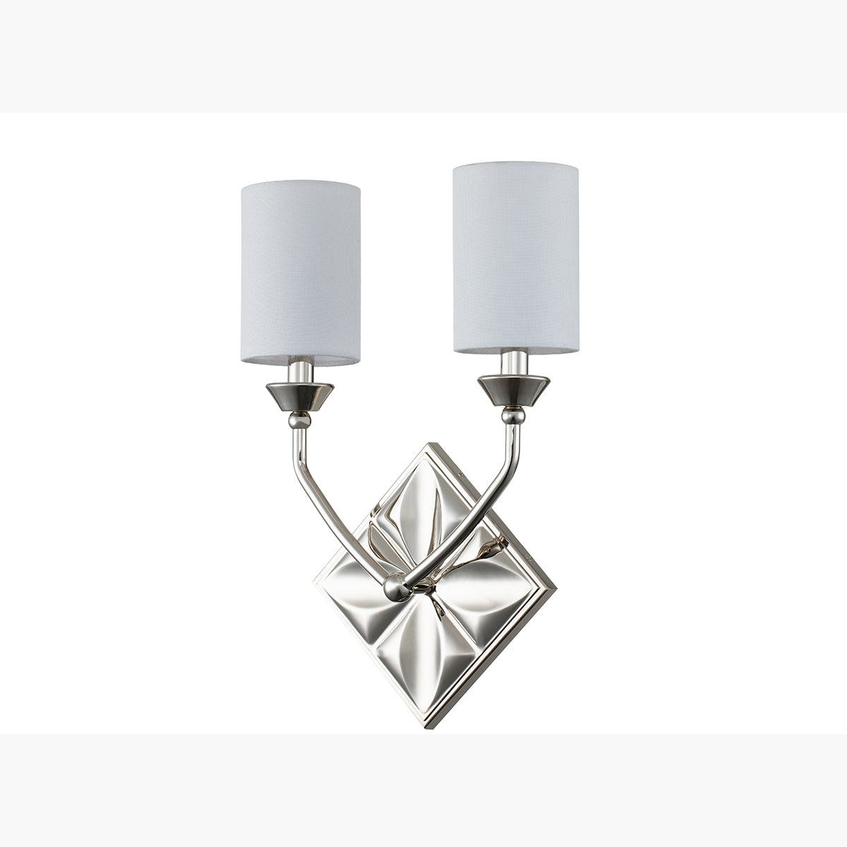Epsilon 2 Lt sconce in polished chrome. Hand finished ADA compliant sconce with fabric shades and two 60W bulbs
