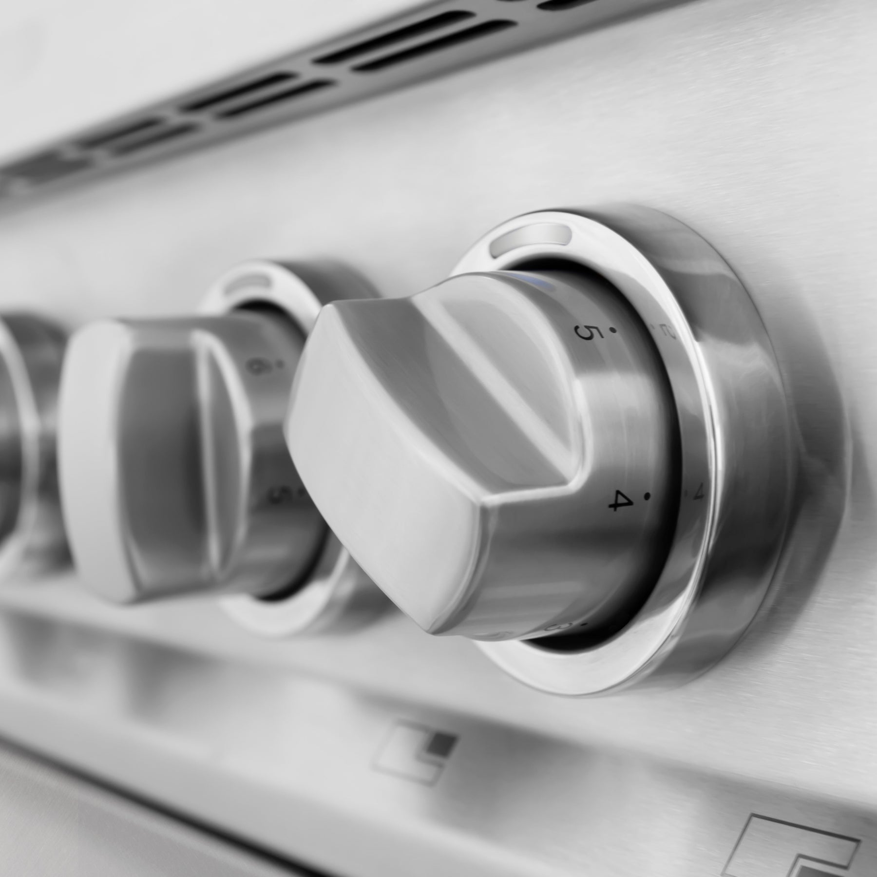 - LED Knob Indicators: Front control knobs illuminate when the cooktop or oven is in use, providing added safety and convenience