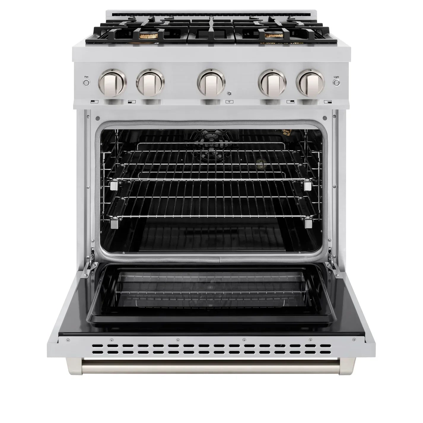 The ZLINE 30" 4.2 cu. ft. Select Gas Range with Convection Gas Oven in Stainless Steel with 4 Brass Burners (HGR-BR-30) combines the elegance of a hand-finished porcelain gas cooktop with 4 Italian-made brass auto-reignition burners, a gas convection oven with an energy-efficient cooling fan to ensure quiet operation, and a Horizon oven door window design allowing you to master every meal. With a modern, timeless style and refined functionality, ZLINE Select Gas Ranges are masterfully crafted to deliver an elevated culinary experience.
