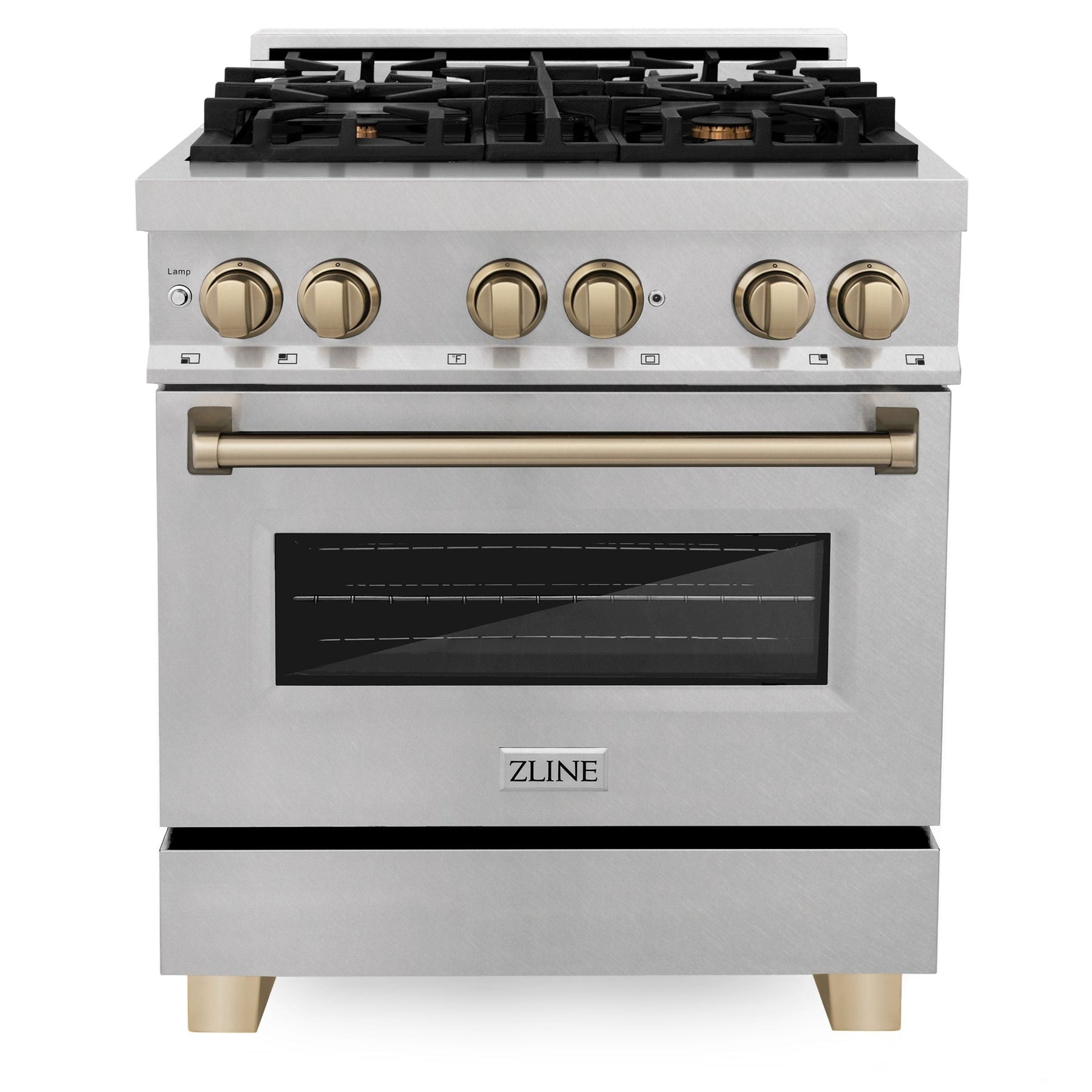 - ZLINE Kitchens's Italian brass burners give this range an elevated, timeless pop of color while providing enhanced cooking benefits such as superior heat retention and even flame distribution.