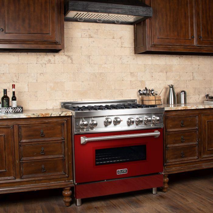 This ZLINE kitchen appliance package has a powerful Red gloss, stainless steel 36" inch Gas on Gas range, and 36 inch Range Hood. This premium and professional appliance package is available for your kitchen remodel or build at an affordable price!