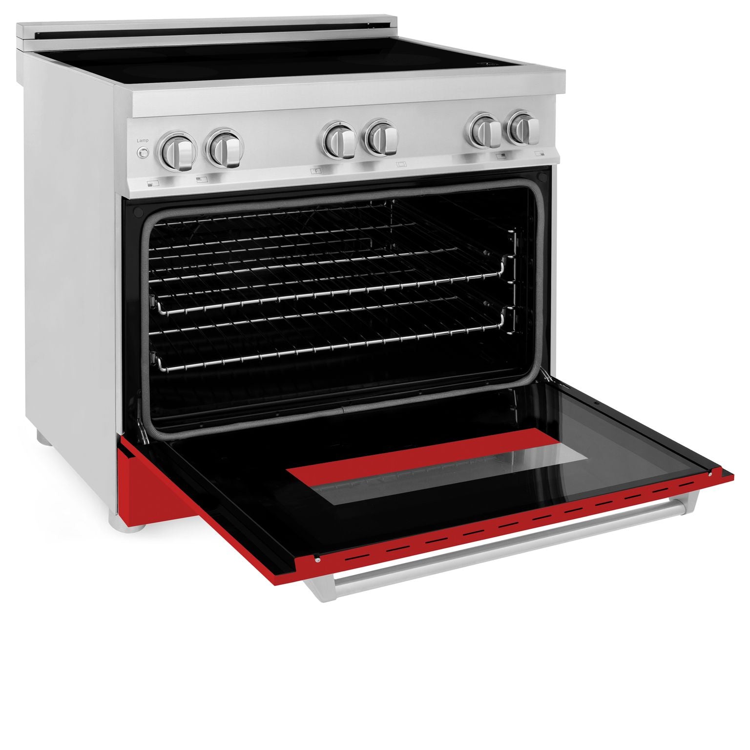 The ZLINE 36" Induction Range with a 4 Element Stove and Electric Oven in Stainless Steel with Red Matte Door blends consistent precision and speed with its innovative technology and sleek, glass cooktop. Achieve incredibly fast heat and a quick boil with induction technology that heats 50% faster than comparable cooktops. ZLINE induction cooktops utilize superior electromagnetic technology to efficiently heat up magnetic stainless or cast iron cookware, while saving more energy compared to gas or electric cooking. Enhance your kitchen experience with versatile cooking features including Power Boost and Power Sharing, which maximize power and heat with a quick turn of a knob.