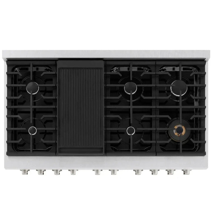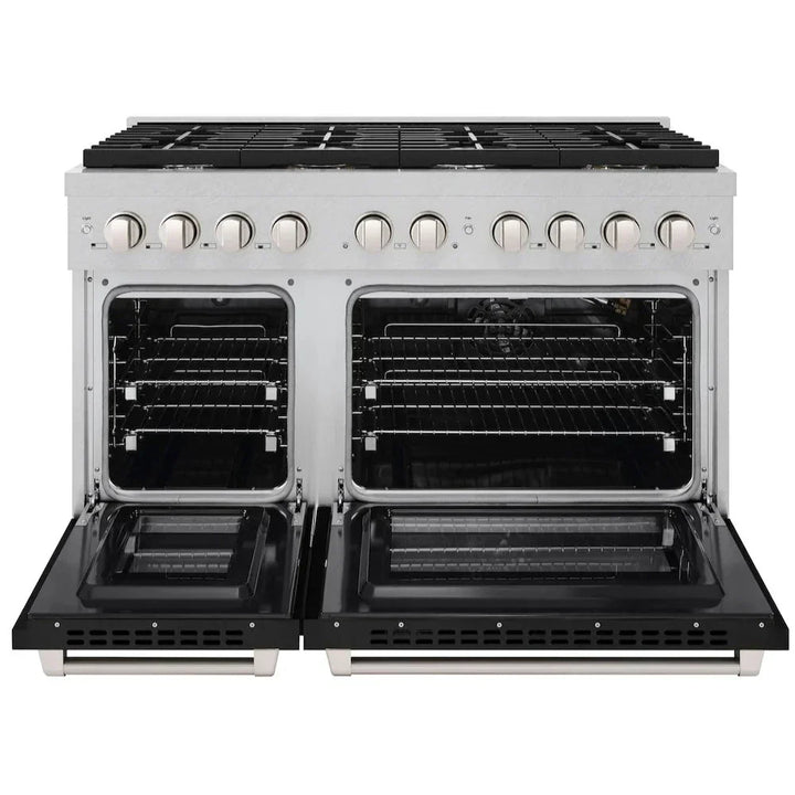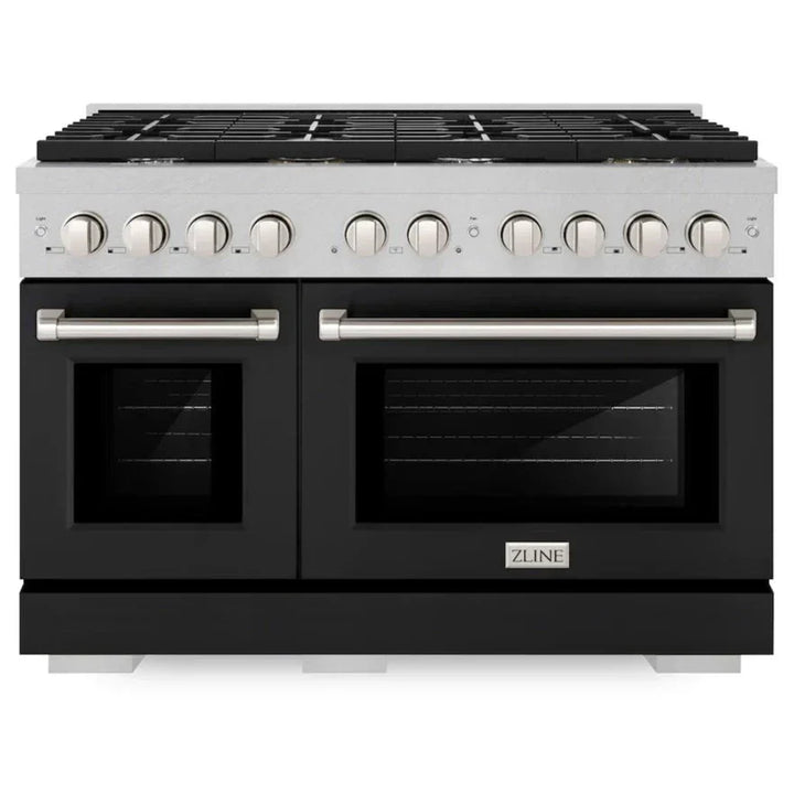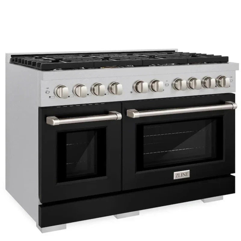 The ZLINE 48" 6.7 cu. ft. Gas Range with Convection Oven in DuraSnow® Stainless Steel and Black Matte Doors (SGRS-BLM-48) offers a practical approach to luxury cooking. With 8 Italian-made burners, a spacious gas convection oven, and an additional small baking oven, this range allows for versatile and precise cooking. Its sleek and modern design, along with its top-quality construction, makes it a top choice for those who seek an enhanced cooking experience.