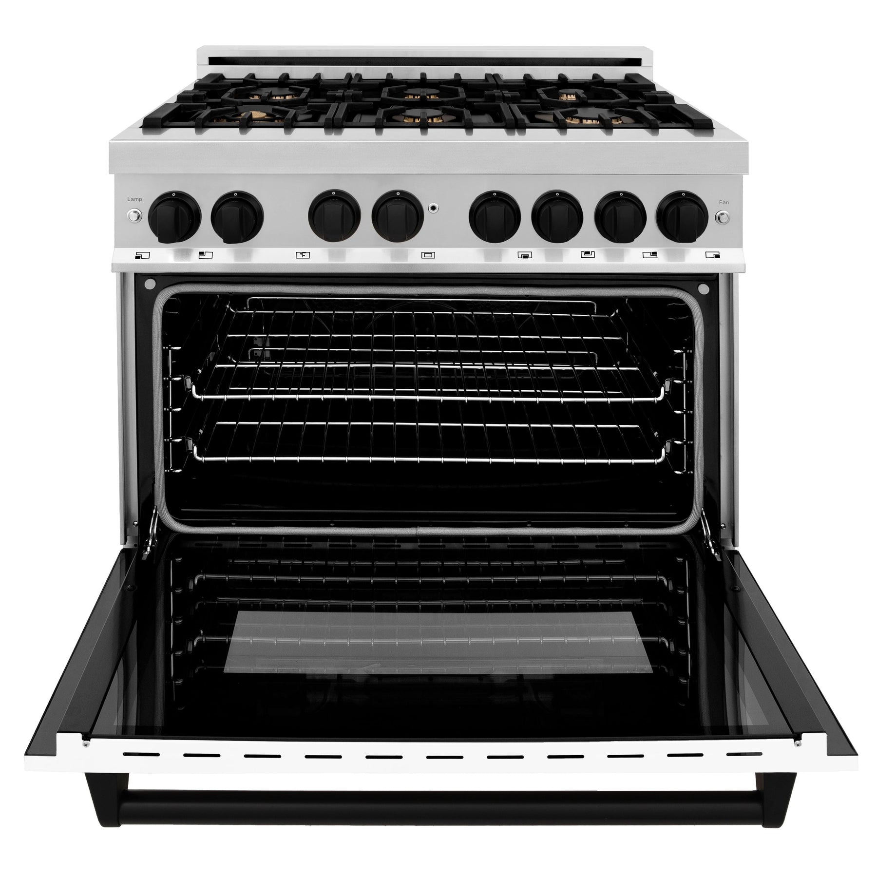 - ZLINE Autograph Edition 36 in. 4.6 cu. ft. Dual Fuel Range with Gas Stove/Electric Oven with White Matte Door and Matte Black Accents, RAZ-WM-36-MB