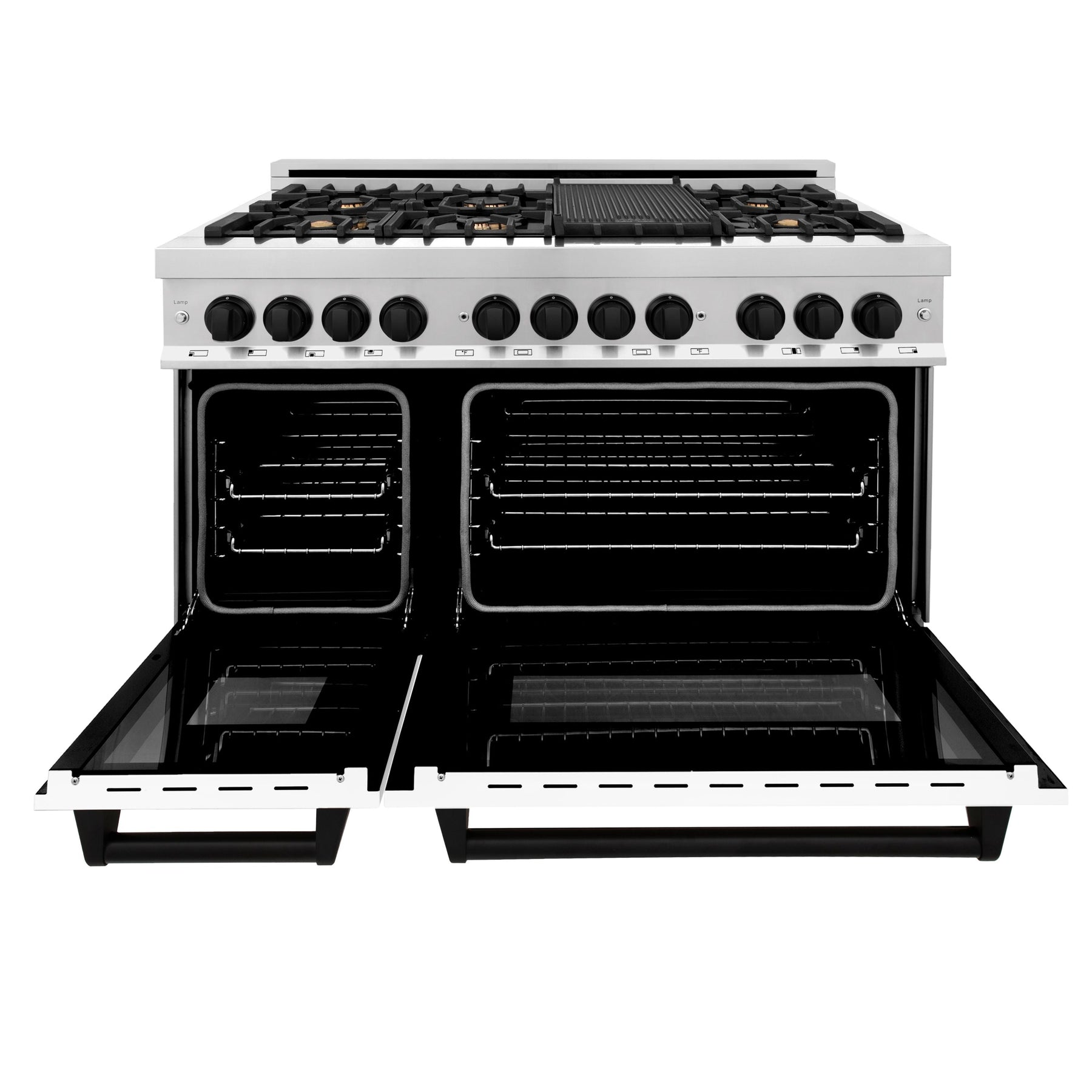 - ZLINE Autograph Edition 48 in. 6.0 cu. ft. with Gas Stove and Electric Oven in Stainless Steel with White Matte Door and Matte Black Accents, RAZ-WM-48-MB