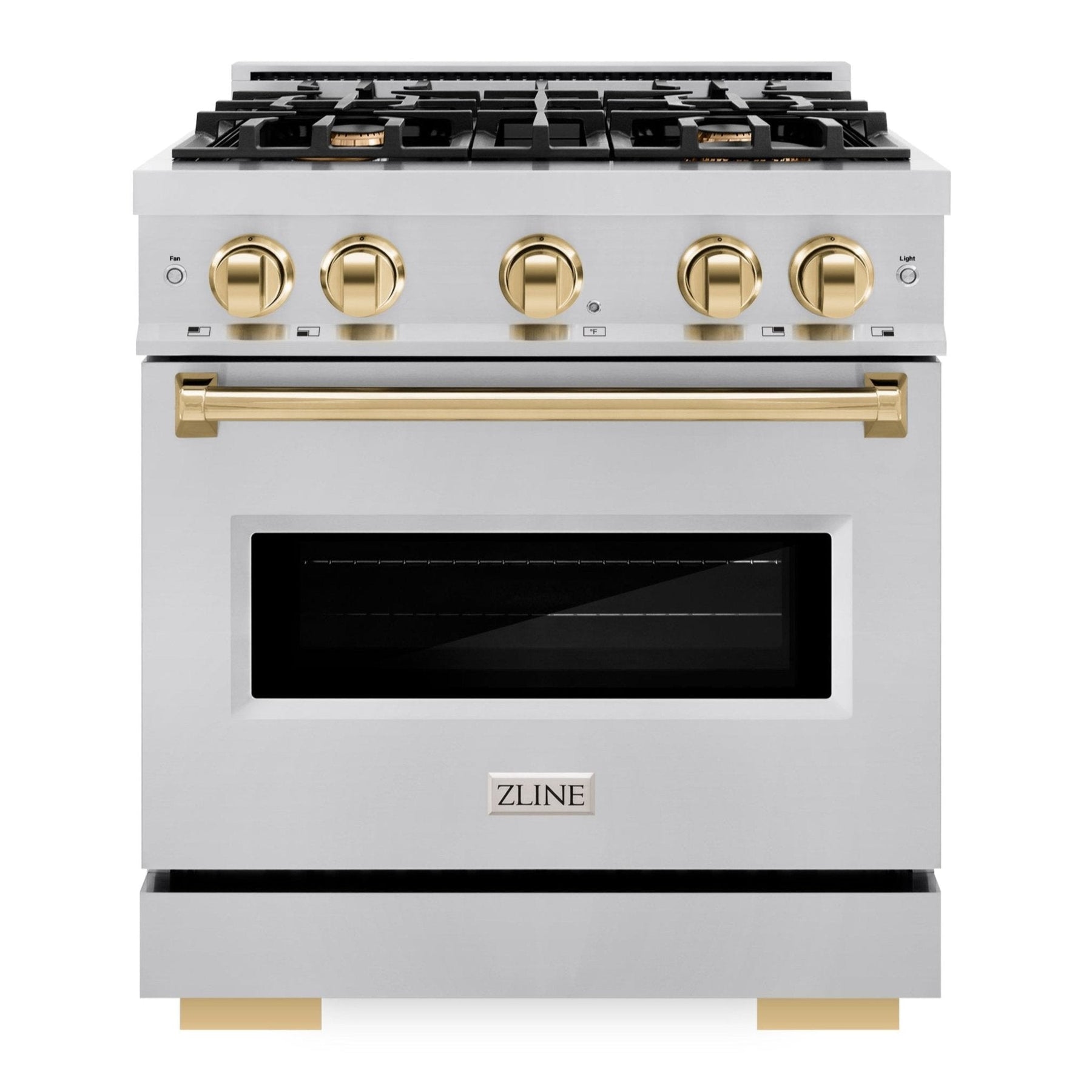 The ZLINE Autograph Edition 30" 4.2 cu. ft. Classic Dual Fuel Range with 4 Burner Gas Cooktop and Electric Convection Oven in Stainless Steel with Polished Gold Accents (CDRZ-30-G) combines the elegance of a hand-finished porcelain gas cooktop with 4 Italian-made auto-reignition burners, an electric convection oven with an energy-efficient cooling fan to ensure quiet operation, a Landscape oven door window design, and stunning polished gold knobs and handle allowing you to master every meal. With a modern, timeless style and refined functionality, ZLINE Classic Dual Fuel Ranges are masterfully crafted to deliver an elevated culinary experience.
