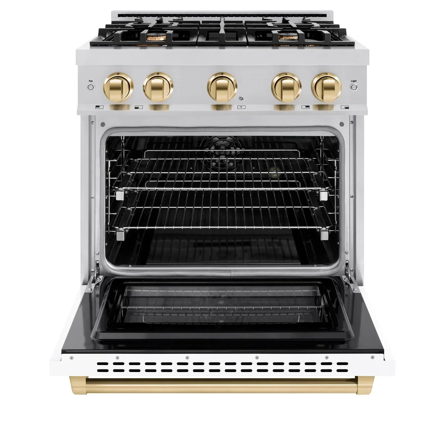 The ZLINE Autograph Edition 30" 4.2 cu. ft. Select Dual Fuel Range with 4 Burner Gas Cooktop and Electric Convection Oven in Stainless Steel with White Matte Door and Polished Gold Accents (HDRZ-WM-30-G) combines the elegance of a hand-finished porcelain gas cooktop with 4 Italian-made auto-reignition burners, an electric convection oven with an energy-efficient cooling fan to ensure quiet operation, a beautiful white matte door with a Horizon window design, and stunning polished gold knobs and handle allowing you to master every meal. With a modern, timeless style and refined functionality, ZLINE Select Dual Fuel Ranges are masterfully crafted to deliver an elevated culinary experience.