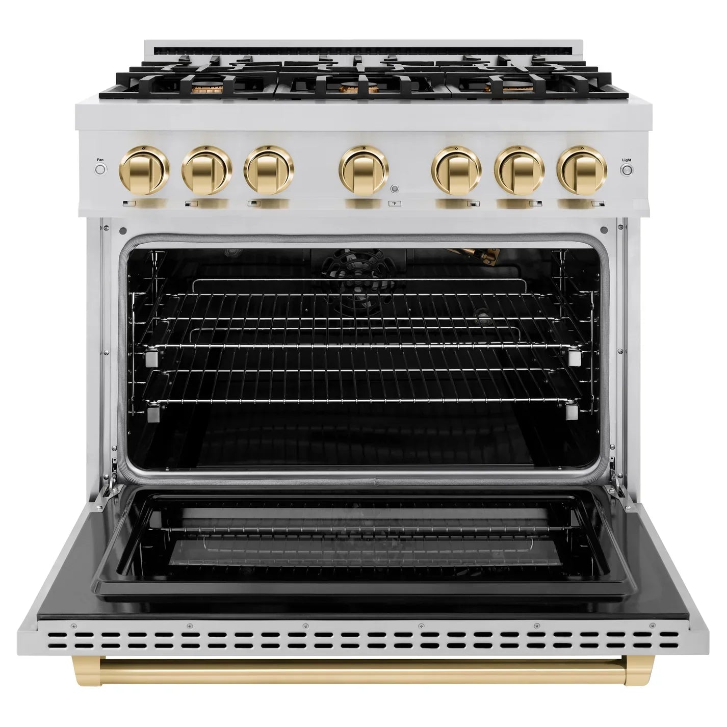 The ZLINE Autograph Edition 36" 5.2 cu. ft. Select Gas Range with 6 Burner Cooktop and Convection Gas Oven in Stainless Steel and Polished Gold Accents (HGRZ-36-G) combines the elegance of a hand-finished porcelain gas cooktop with 6 Italian-made auto-reignition burners, a gas convection oven with an energy-efficient cooling fan to ensure quiet operation, a Horizon oven door window design, and stunning polished gold knobs and handle allowing you to master every meal. With a modern, timeless style and refined functionality, ZLINE Select Gas Ranges are masterfully crafted to deliver an elevated culinary experience.