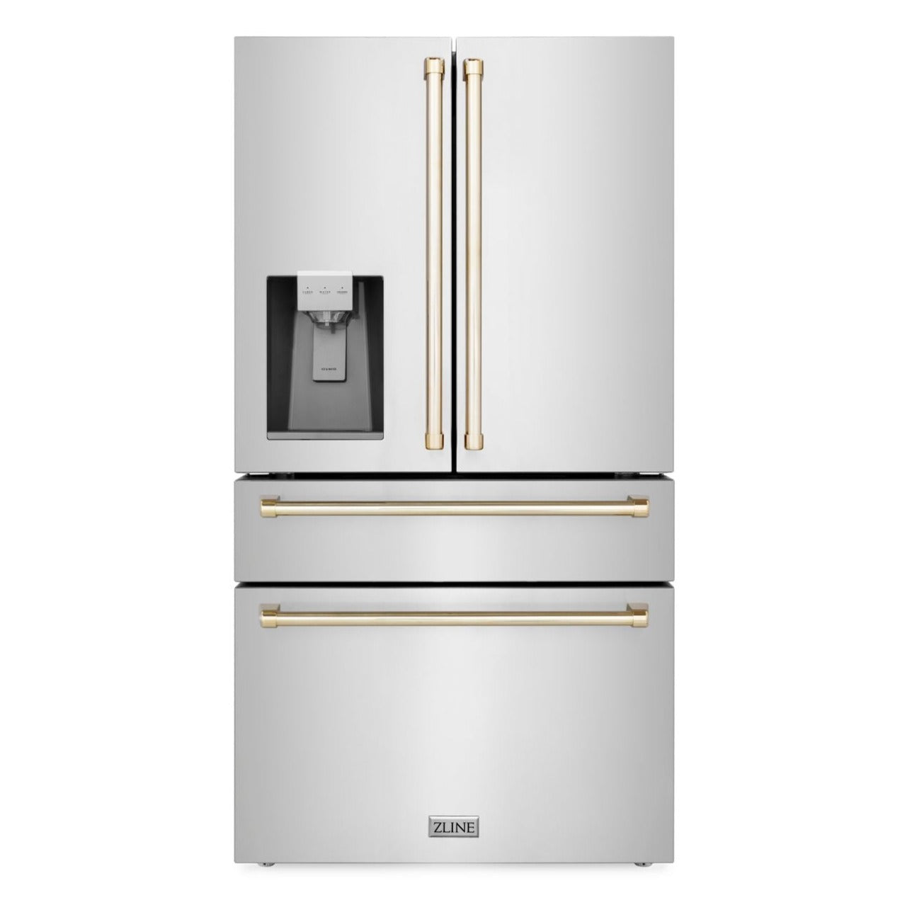 - ZLINE 36 In. Autograph French Door Refrigerator with Water and Ice Dispenser in Fingerprint Resistant Stainless Steel with Gold Accents, RFMZ-W-36-G