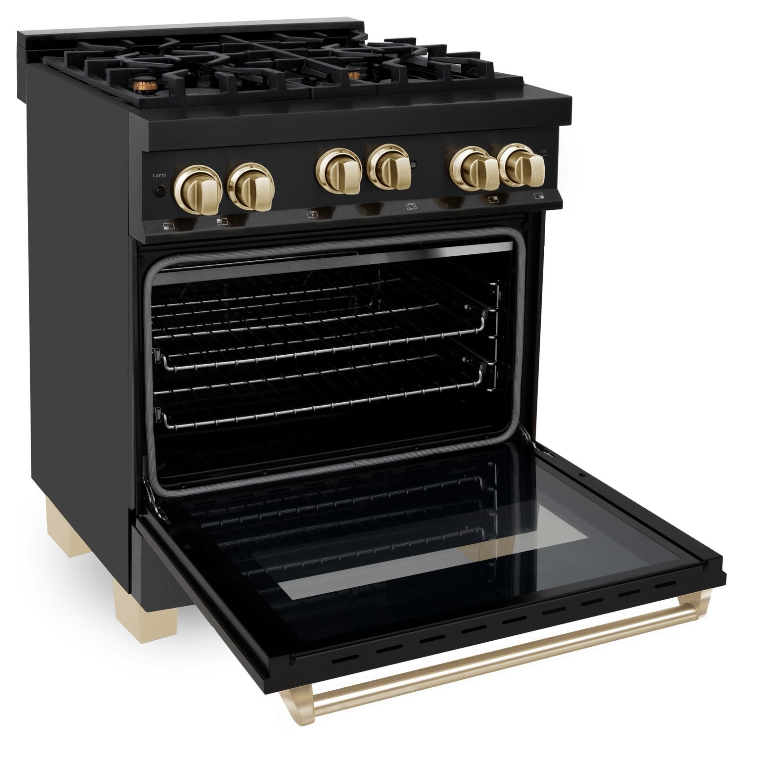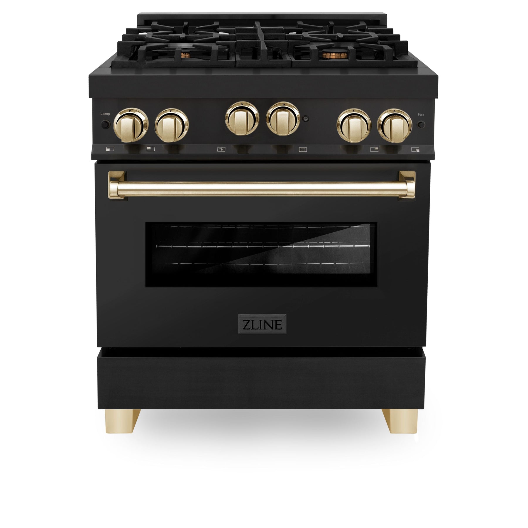 - ZLINE Autograph Edition 30 in. 4.0 cu. ft. Range with Gas Burner/Gas Oven in Black Stainless Steel with Gold Accents, RGBZ-30-G