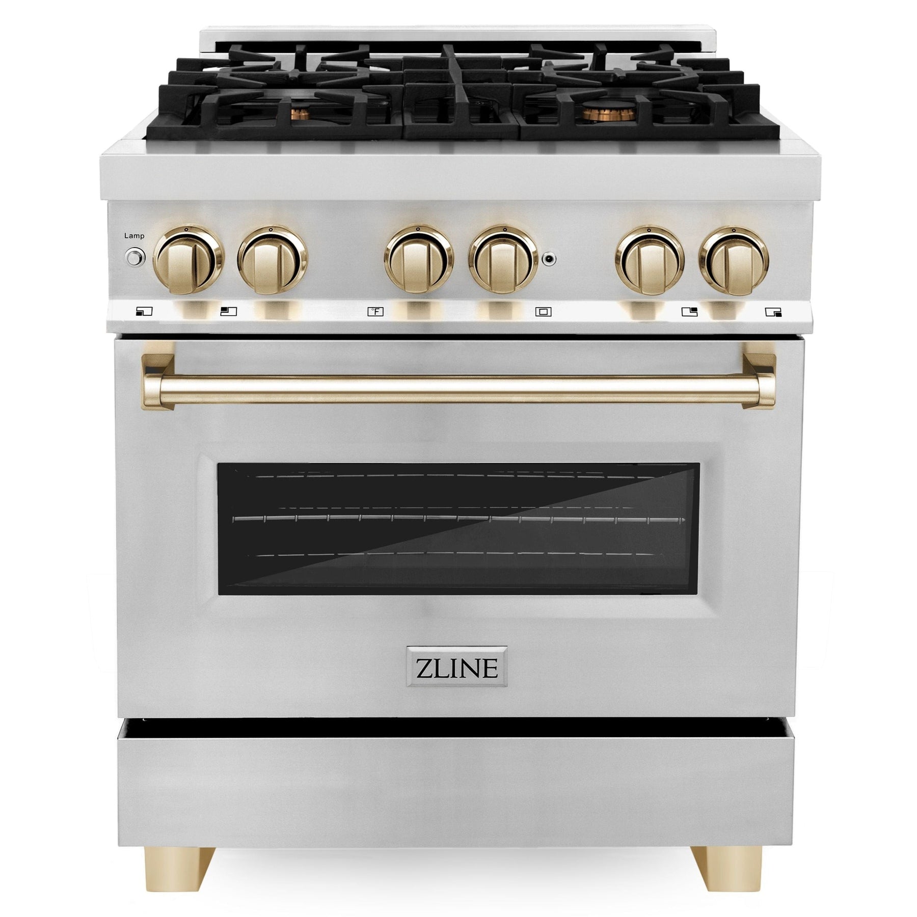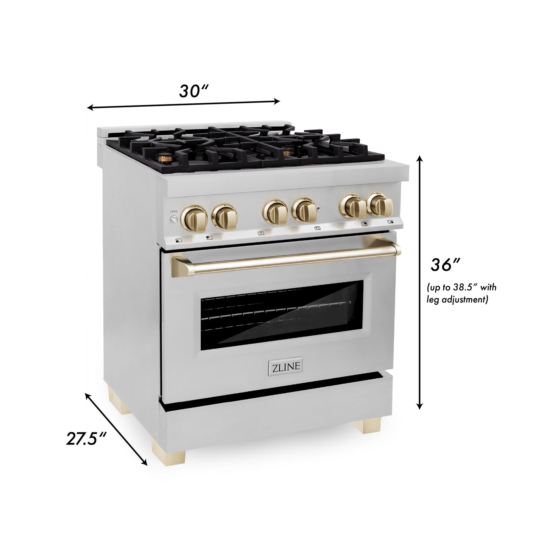 - ZLINE Autograph Edition 30 in. 4.0 cu. ft. Gas Burner/Electric Oven in Stainless Steel with Gold Accents, RAZ-30-G