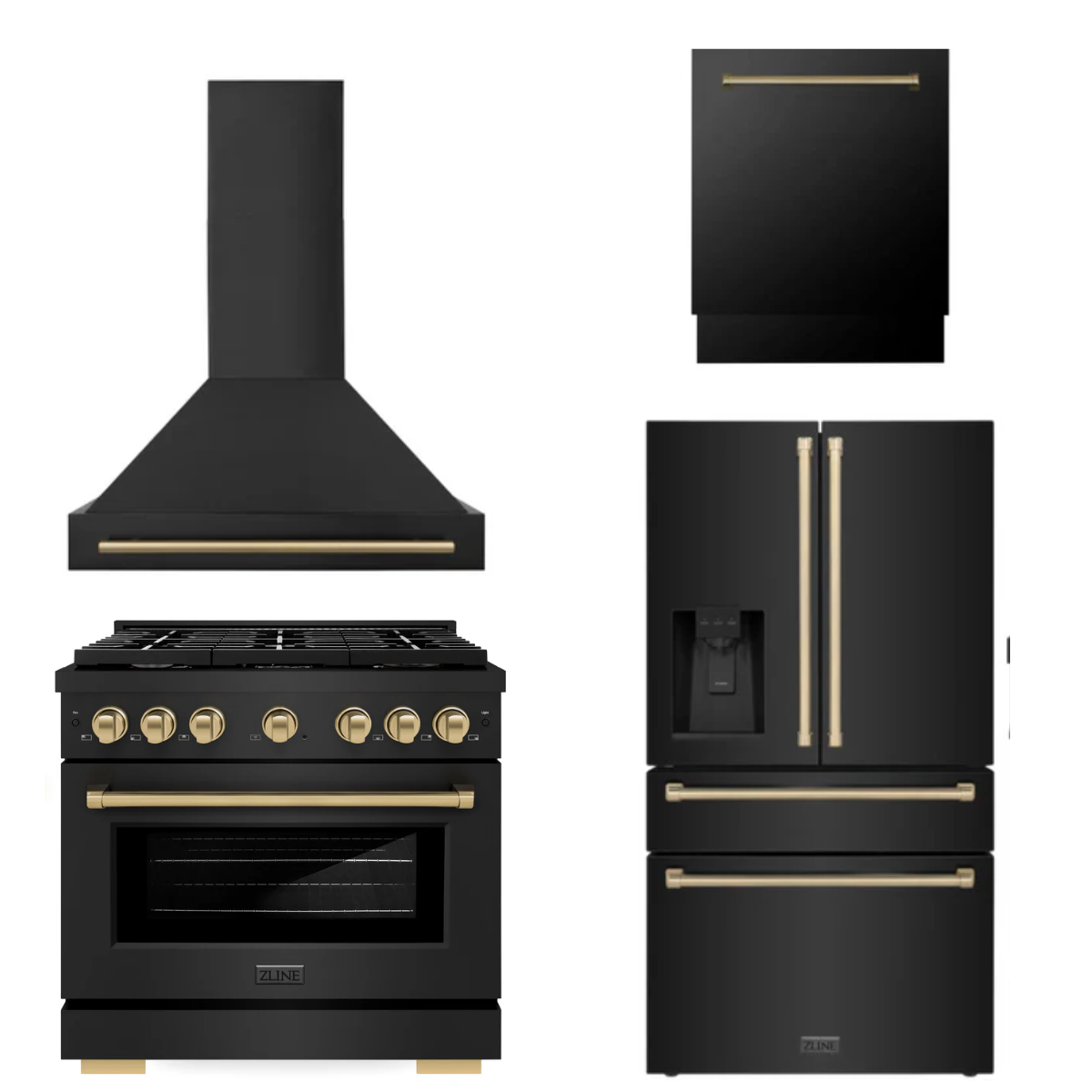 This ZLINE Kitchen Autograph Appliance Package has a powerful Black Stainless Steel 36" Gas Range, 36" Wall Mount Range Hood, 24" 3 Rack Dishwasher, and 36" Refrigerator with Water and Ice Dispenser - all with eye-popping Champagne Bronze Accents!