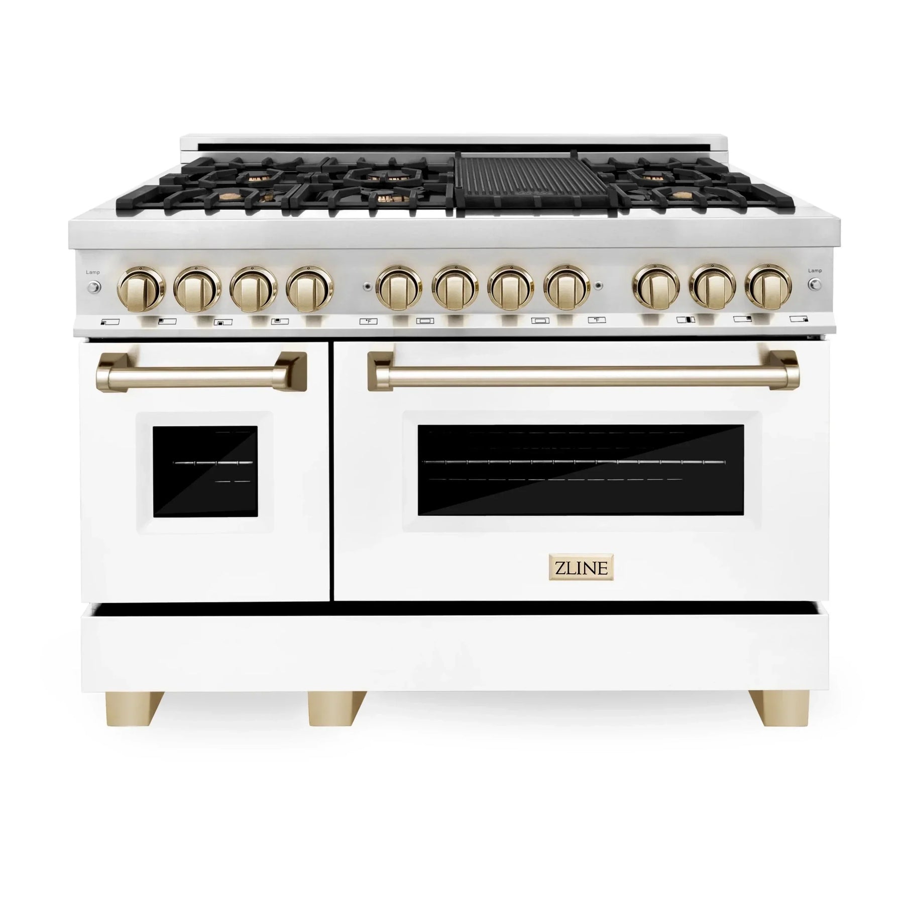 - ZLINE Autograph 48 in. Gas Burner/Electric Oven in Stainless Steel, White Matte Door with Gold Accents, RAZ-WM-48-G