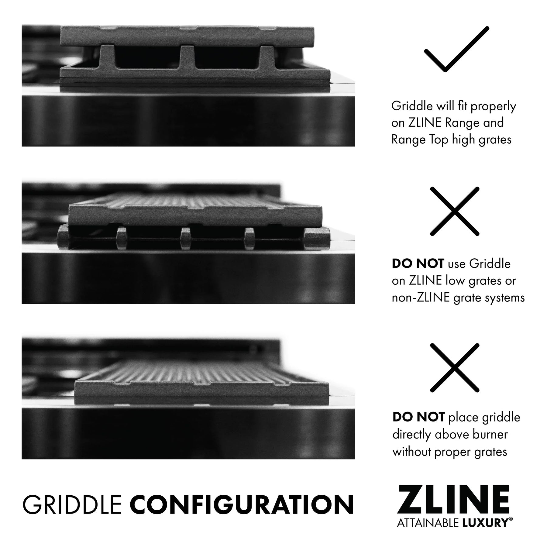 - DO NOT use Griddle on ZLINE low grates or non-ZLINE grate systems