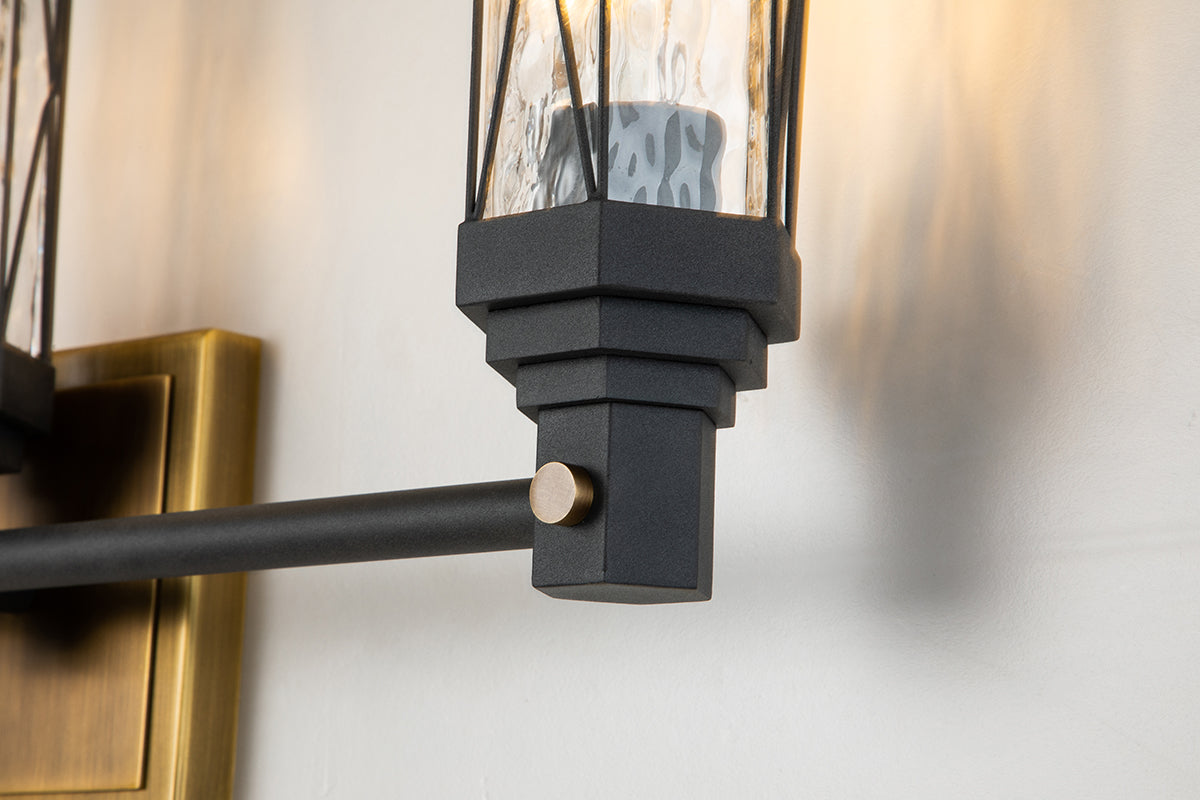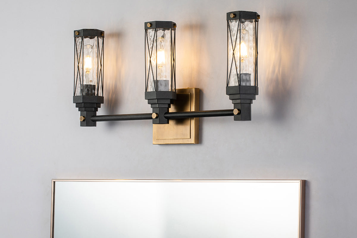 Charming and vintage inspired, the Abbey Over-the-mirror vanity light uses a mixed aged brass and black finish to give a genuine and edgy style that makes sure you won’t forget it. It’s shaped like a hexagon and has a bold-looking X alternating pattern on the water glass allowing these elements to work together providing this fixture with its own distinctive style. This three-light cylinder shaped bathroom bar light can be installed facing up or down, and uses a modern crisp shape to update your bathroom space.
