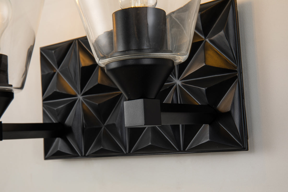 Always looking to add texture and dimension to a room, we created the perfect 2-light wall sconce. The 15.5 inch rectangle back plate with a pressed textured shape creates a modern design completing our intent. Showcasing the elegant Matte Black finish and a sleek cone-shaped, clear shade that can be mounted either up or down, we are giving that extra touch to show our attention to design and our love for the details.