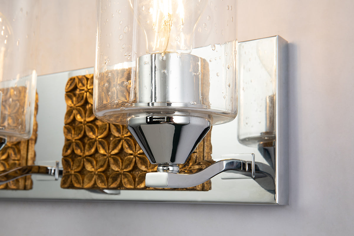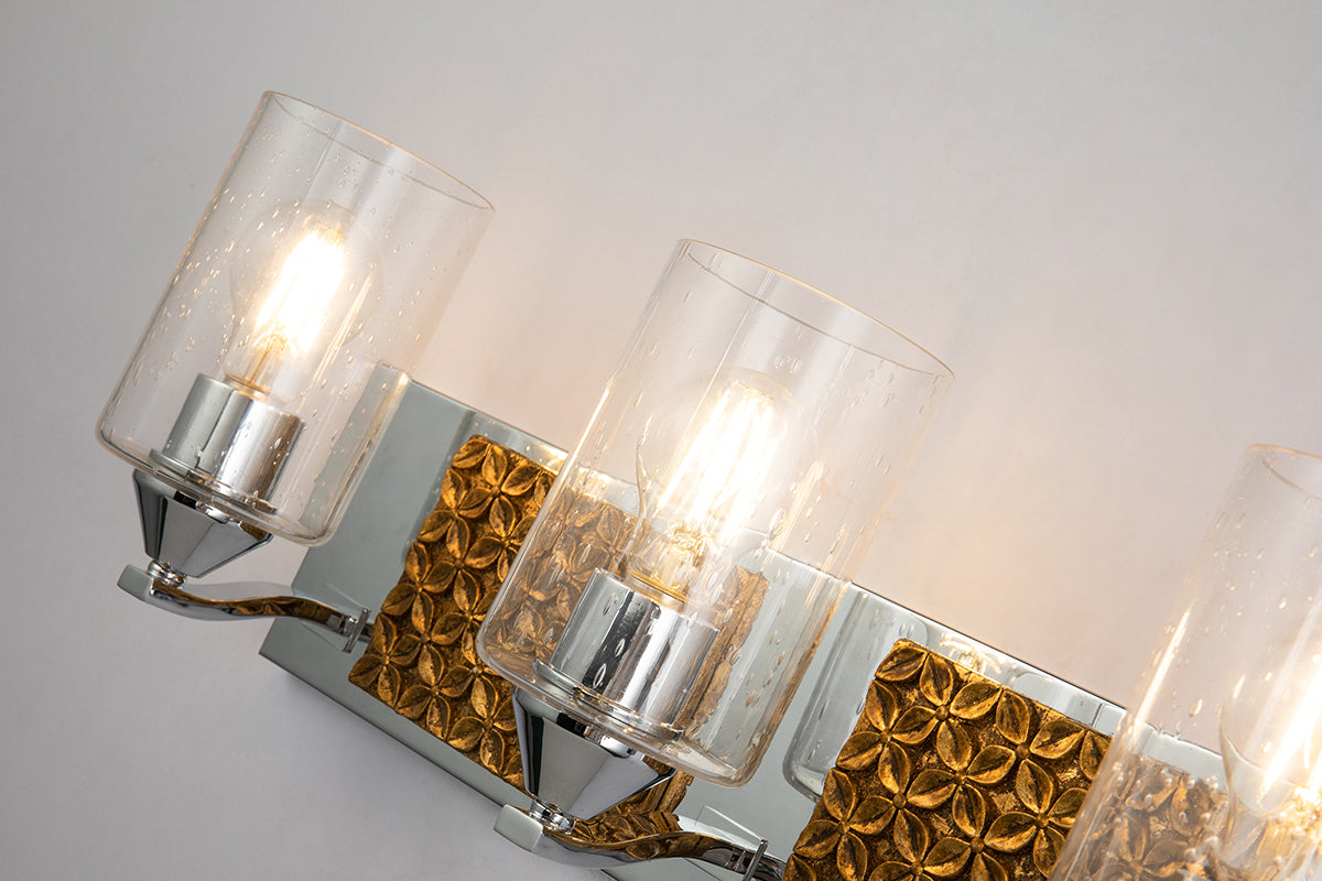 Clean lines and timeless design this triple vanity light is perfect for brightening your bathroom space giving it texture and dimension. Featuring a clean-cut rectangle backplate with textured traditional shapes, simple curved arm and a unique two-toned finish of polished chrome and antique gold. Showing off its contemporary side, this 3-light bathroom light uses a cylinder shaped clear seeded glass to bring attention to the mix of texture and details that come together in our Arcadia collection. Measuring 23" Wide, 8" in height and 6.5" in depth, this three-light vanity light can fit in nearly any space.