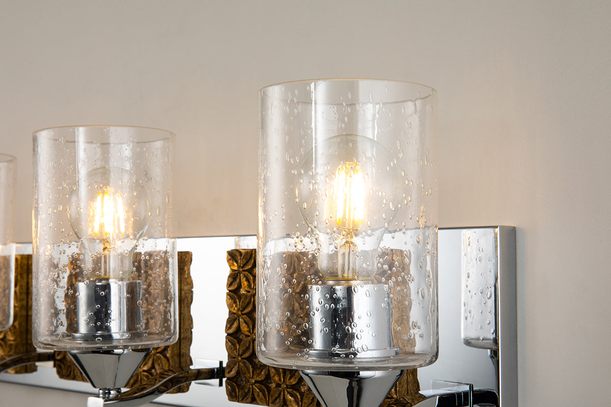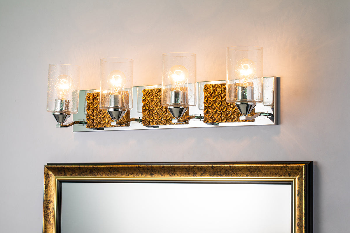 Clean lines and timeless design this 4-light vanity light is perfect for brightening your bathroom space giving it texture and dimension. Featuring a clean-cut rectangle backplate with textured traditional shapes, simple curved arm and a unique two-toned finish of polished chrome and antique gold. Showing off its contemporary side, this 4-light bathroom light uses a cylinder shaped clear seeded glass to bring attention to the mix of texture and details that come together in our Arcadia collection. Measuring 35" Wide, 8" in height and 6.5" in depth, this four-light vanity light can fit in nearly any space.