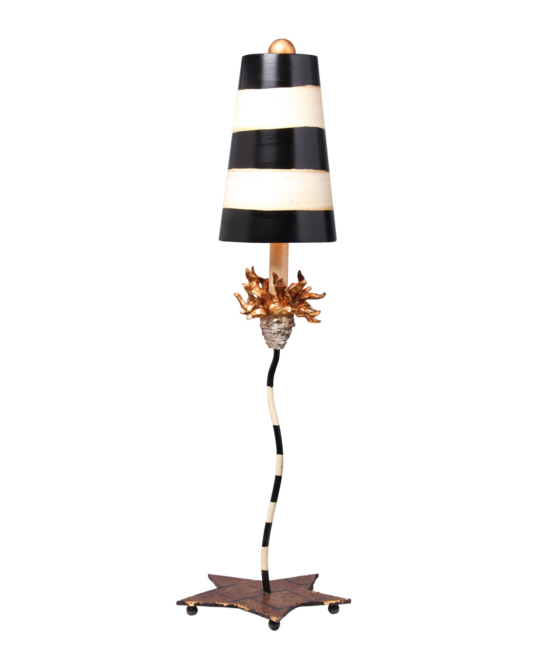 Highlighted by the Classic Charm of using Black and White Stipes and a touch of Antiqued Silver and Gold , this lovely Tall Buffet table lamp adds a Whimsical elegance to your Entryway or study. Complete the vignette by adding a stack of books, frames, and an eye-catching candleholder. Striking a balance between shabby chic and Eclectic, this beauty is a 40 Inch tall table and buffet lamp. Having a 10" star shaped base, and a gold leaf element at the top of the lamp brings a sophisticated appeal to this New Orleans Flambeau inspired lamp.