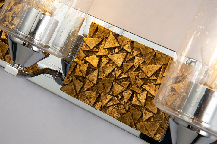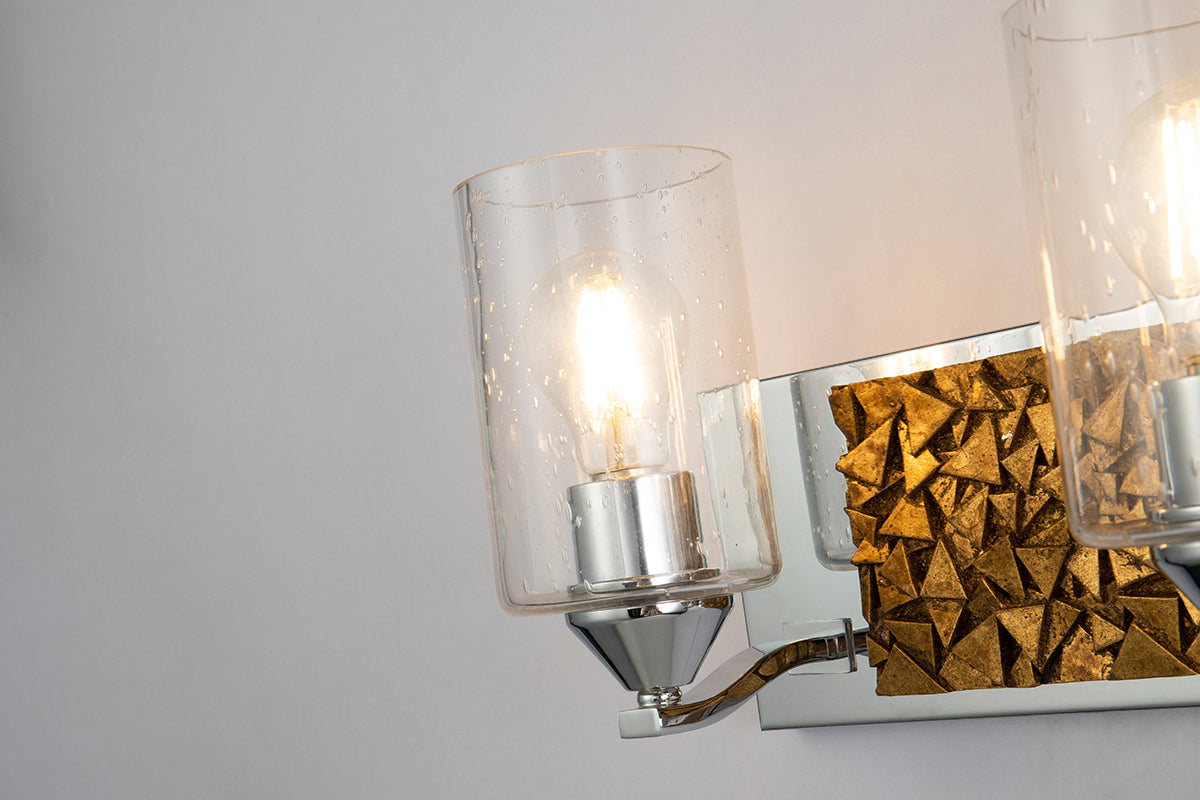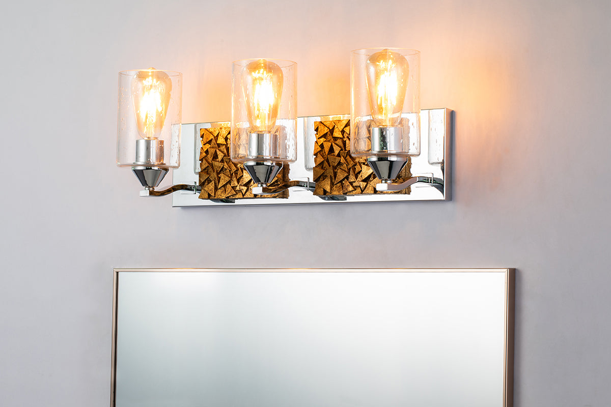 Clean lines and timeless design this triple vanity light is perfect for brightening your bathroom space giving it texture and dimension. Featuring a clean-cut rectangle backplate with textured traditional shapes, simple curved arm and a unique two-toned finish of polished chrome and antique gold. Showing off its contemporary side, this 3-light bathroom light uses a cylinder shaped clear seeded glass to bring attention to the mix of texture and details that come together in our Bocage collection. Measuring 23" Wide, 8" in height and 6.5" in depth, this three-light vanity light can fit in nearly any space.