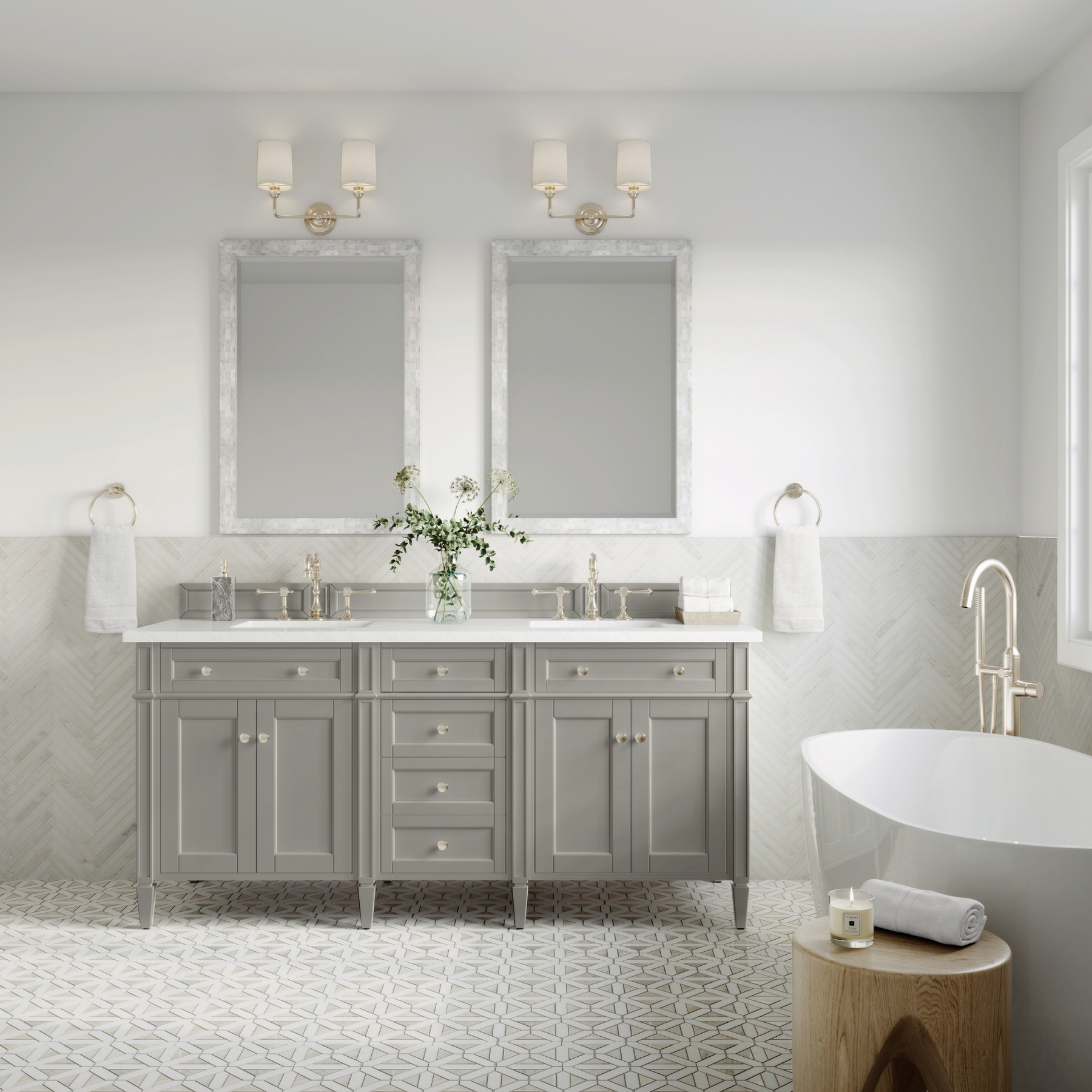 The Brittany 72" Urban Gray Double Vanity by James Martin Vanities features classic details that bridge both traditional and transitional styles. This beautiful piece of furniture includes two hide-away tip-out, top row drawers and four full-depth drawers. This cabinet also has four doors which conceal interior shelves for ample storage. Handcrafted in yellow poplar solids and veneers with satin nickel hardware. Matching wood backsplash is included. The look is completed with a 3 CM eased edge 3 CM eased edge White Zeus Silestone top with two white ceramic rectangular sinks.