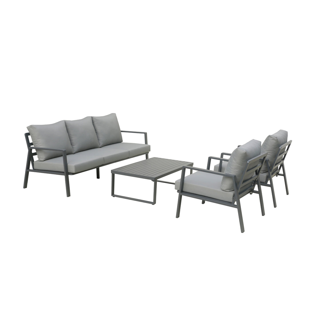 Introducing our Outdoor Patio Set & Coffee Table – a perfect blend of style and durability crafted for your outdoor sanctuary. Enjoy the comfort of polyurethane cushions, the resilience of a powder-coated frame, and the all-weather resistance of polyester material in this chic ensemble. Upgrade your outdoor area with the perfect combination of comfort and durability, whether you're hosting gatherings, enjoying quiet moments, or sipping your morning coffee, this ensemble provides an elevated outdoor experience that complements the beauty of your surroundings.