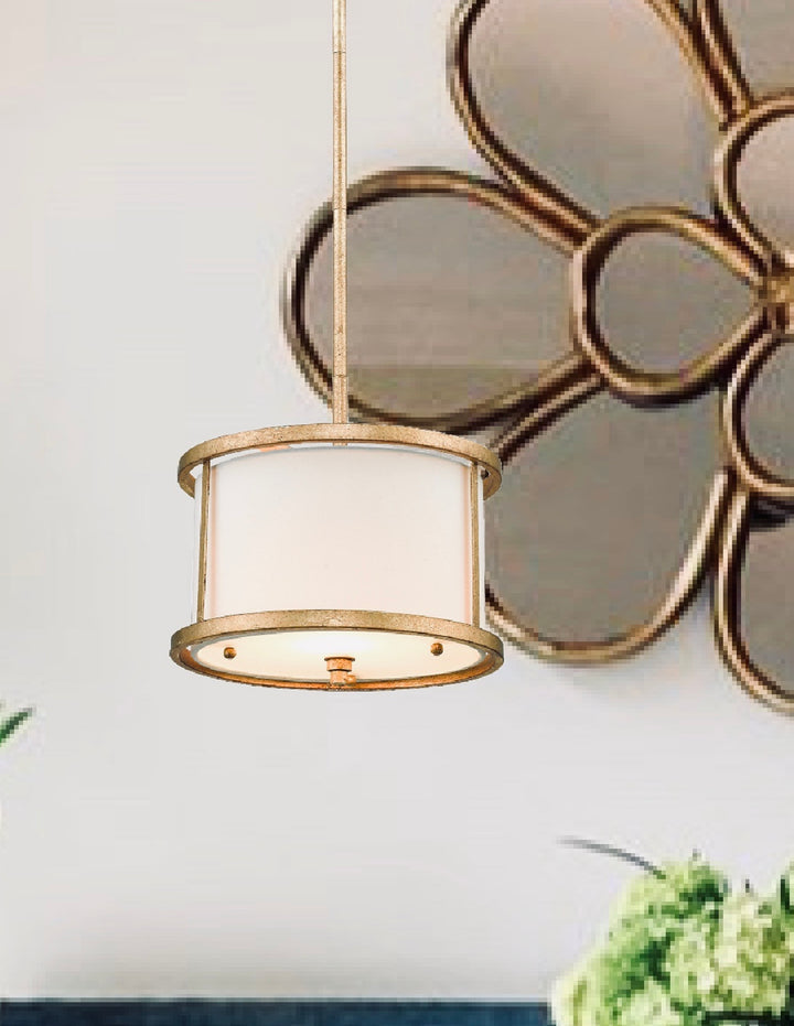 A one-of-a-kind design that is the perfect focal point in our Warm Vintage Gold finish. Simple, sophisticated design and on-trend distressed gold finish makes this go-anywhere mini pendant and ideal option for creating ambient light in a charming and stylish way. The beautifully designed Lemuria series has a distressed gold metal outer shade with a cream linen fabric inner shade and glass diffuser to soften the light. The Mini pendant is shipped with extra stems for an adjustable height, and can be installed as a semi-flush.