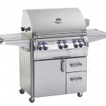 Exclusive Features of The ECHELON DIAMOND E790 include a builtin paper towel holder, backlit safety knobs, contoured control panel, heat zone separators, hot surface electronic ignition, cart has two 110V plug-in electrical outlets with 12V transformer (builtin requires hard wire, cart requires extension cord), dual internal halogen lamps in hood for easier evening grilling, manual tubes for match lighting, builtin analog grill thermometer, water tight wood chip smoker drawer with dedicated burner, new cast stainless steel "E" burners and stainless steel valve manifold. The newest addition to the Firemagic line. The second largest cooking surface across the line! This grill offers a true 36" across the cooking surface, not the FRAME of the grill like others measure. A total whopping BTU rating of 99,000 on the main cooking surface and a full-length backburner rated at 23,000 BTU's. The total cooking area is almost 800 sq. inches so it can hold just about anything you want to load up!The stainless steel cart features dual storage doors below, a stainless steel prep shelf on the right side, and heavy-duty cart casters for ease of portability. This unit also includes a single side burner on the left side. Echelon Slide Show.