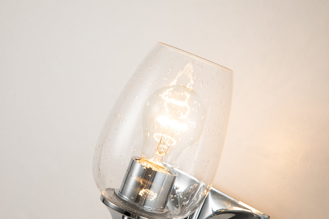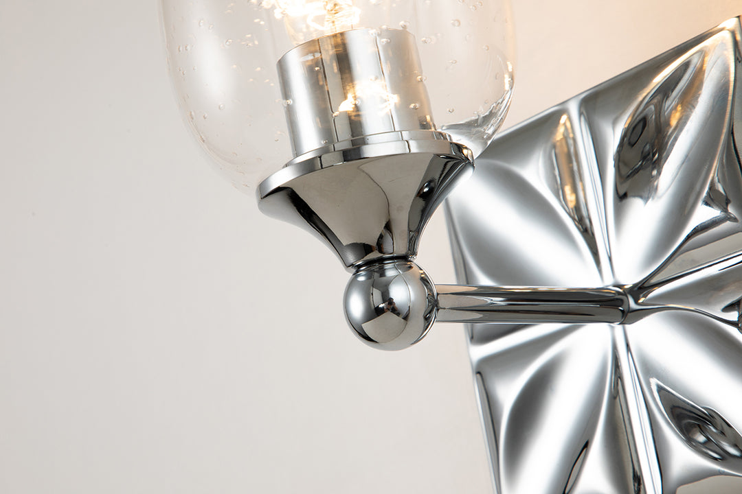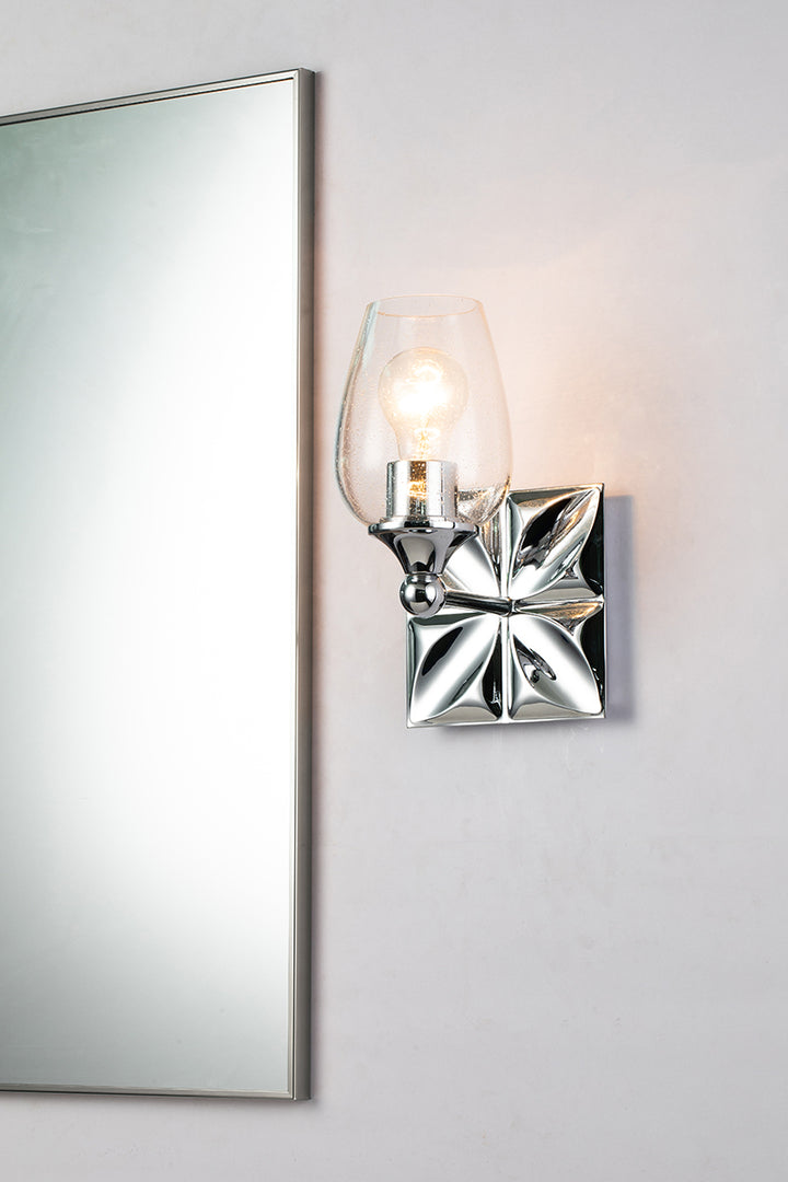 Always looking to add texture and dimension to a room, we created the perfect 1-light wall sconce. The 6 inch square back plate with a pressed textured shape creates a modern design completing our intent. Showcasing the elegant polished chrome finish and a sleek wine glass-shaped, clear seeded glass shade that can be mounted either up or down, we are giving that extra touch to show our attention to design and our love for the details.