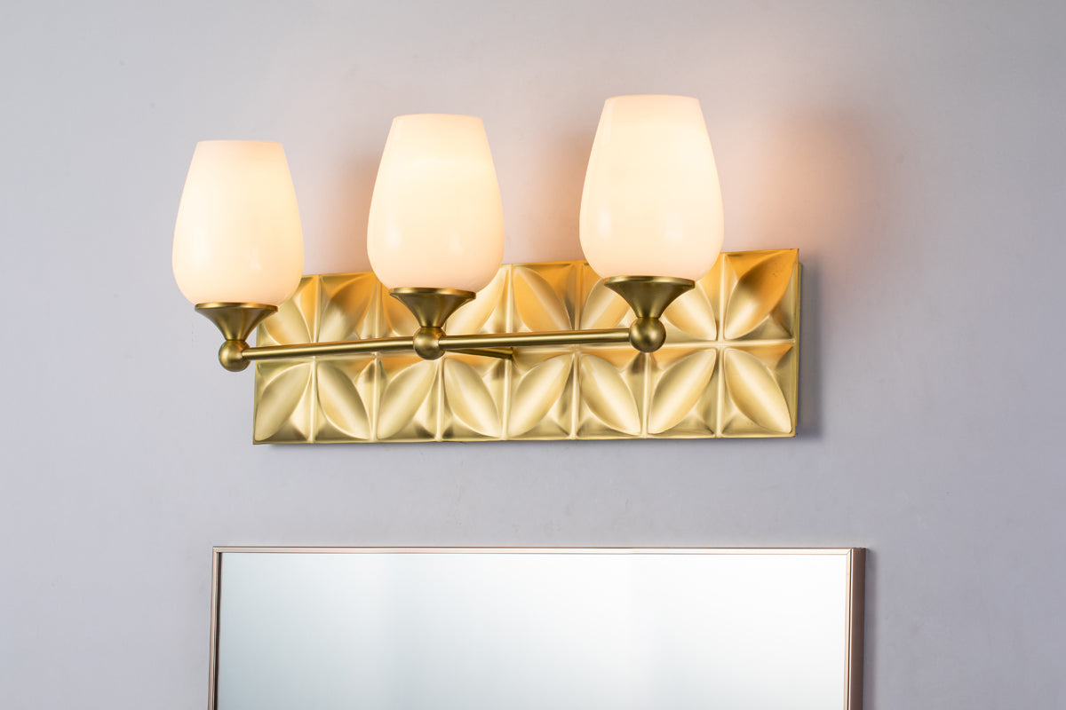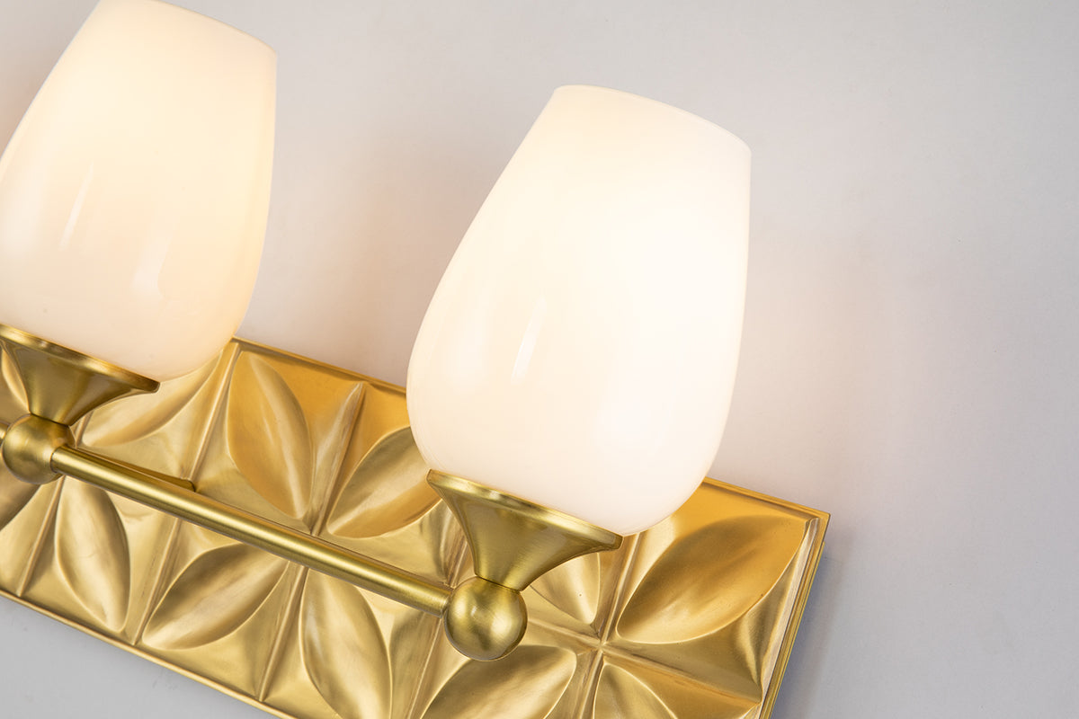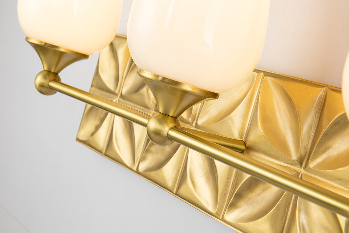 Always looking to add texture and dimension to a room, we created the perfect 3-light bathroom vanity light. The 24 inch back plate with a pressed textured shape creates a modern design completing our intent. Showcasing the elegant aged brass finish and sleek wine glass-shaped, opal glass shades that can be mounted either up or down, we are giving that extra touch to show our attention to design and our love for the details.