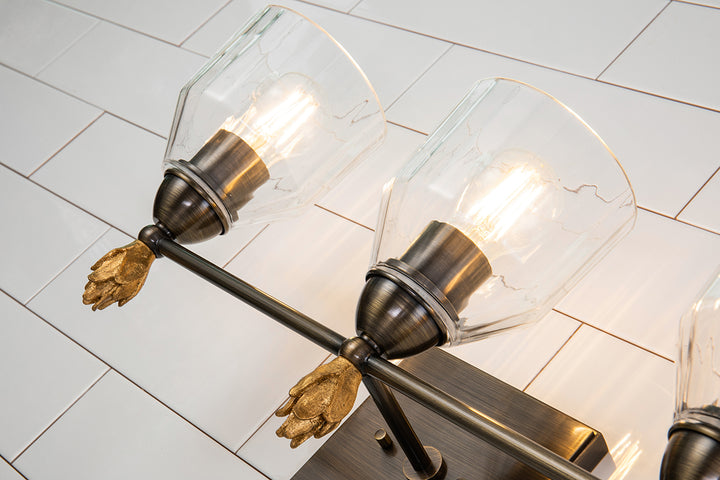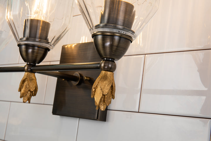 Drawing inspiration from a classic design, this black and gold 3-light vanity light is the perfect pick for any contemporary or traditional space. This Felice design showcases a simple, rectangular 5" square backplate, dome shaped glass shade, and a decorative unique flame-shaped gold finial. Easily installed over your mirror, this two-light sconce is suitable for damp spaces, and is finished in a beautiful matte black.