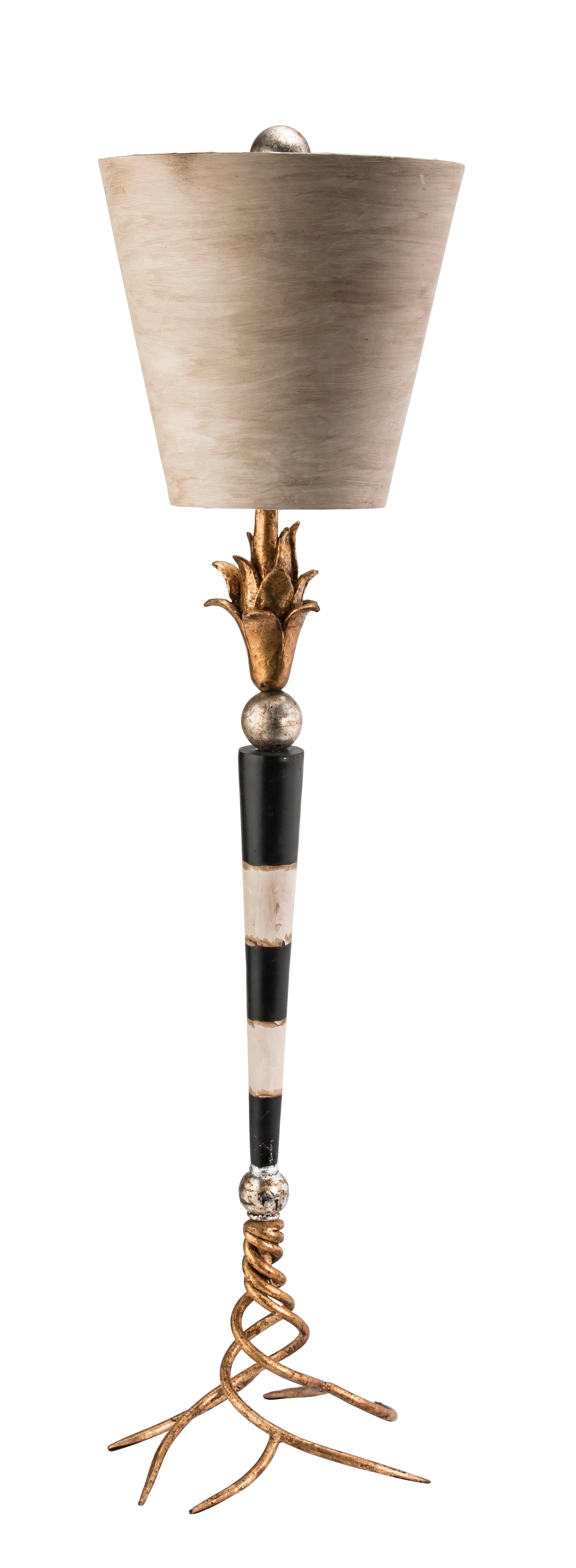 Add a touch of elegant style to your home with the Flambeau Buffet Lamp. With a dramatic base finished in antiqued gold, this table lamp brings a touch of sophistication to any decor. Using the Classic black & White Stripe color scheme, this Charming 36" tall buffet Accent Lamp uses a Classic Dressy look to work in your living, dining or bedroom space. Using a Focal point of stripes as well as the Bisque painted up-side-down shade, this lamp works great in Transitional, whimsical and Eclectic Decors.