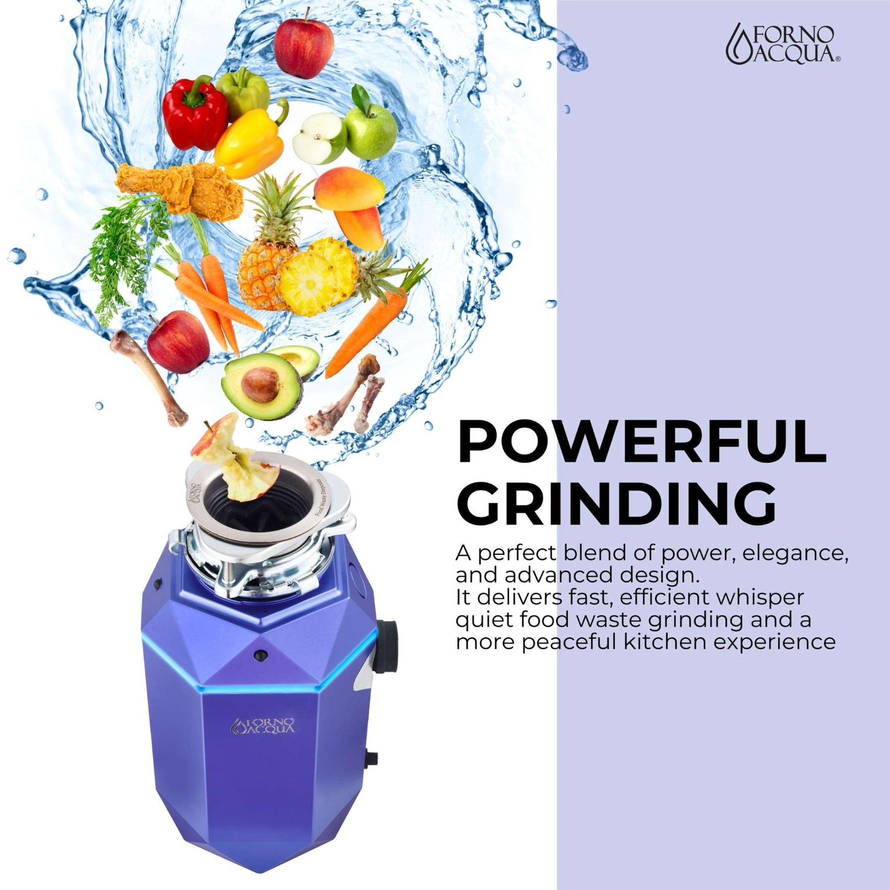 Upgrade your kitchen with the FORNO ACQUA Super Quiet Waste Disposer, a perfect blend of power, elegance, and advanced design. Featuring a permanent magnet motor, it delivers fast, efficient grinding for food waste while operating whisper-quiet for a more peaceful kitchen experience. The innovative BrightDIAMOND 270º Motion-Activated LED Cabinet Light surrounds your cabinet with a stunning cool blue glow, combining modern style with practical lighting to perform chores. Thoughtfully designed, it comes with a pre-wired air switch and plug-in cord, making installation a breeze and using it a pleasure. Built for performance and durability, FORNO ACQUA ensures your kitchen stays clean, functional, and sophisticated. Experience cutting-edge technology, premium craftsmanship, and a touch of brilliance. BrightDIAMOND where lighting and innovation meets garbage disposal excellence..