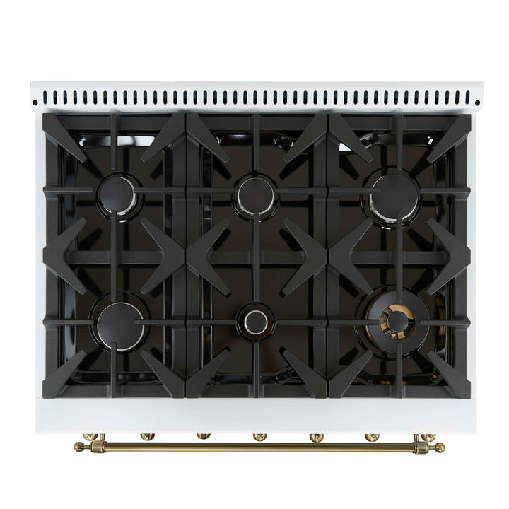 Elevate your kitchen with the stylish and high-performance Forno Antico 36" Gas Range in white, designed to bring elegance, functionality and affordability to your home. With 6 sealed burners and a total output of 71,000 BTU, it delivers the power and precision needed for any culinary challenge. The dual-ring brass burner offers up to 20,000 BTU for high-heat searing and 1,000 BTU for simmering, providing exceptional control. Its spacious 4.5 cu. ft. convection oven ensure even baking and roasting. With its elegant white finish and antique brass accents, the Antico exudes sophistication, while the cast-iron grates provide lasting stability and durability. The recessed enamel cooktop makes cleanup a breeze, combining style with practicality. Whether you're preparing a weeknight dinner or hosting a dinner party, the Antico offers the versatility and power to handle it all, while enhancing the beauty of your kitchen.