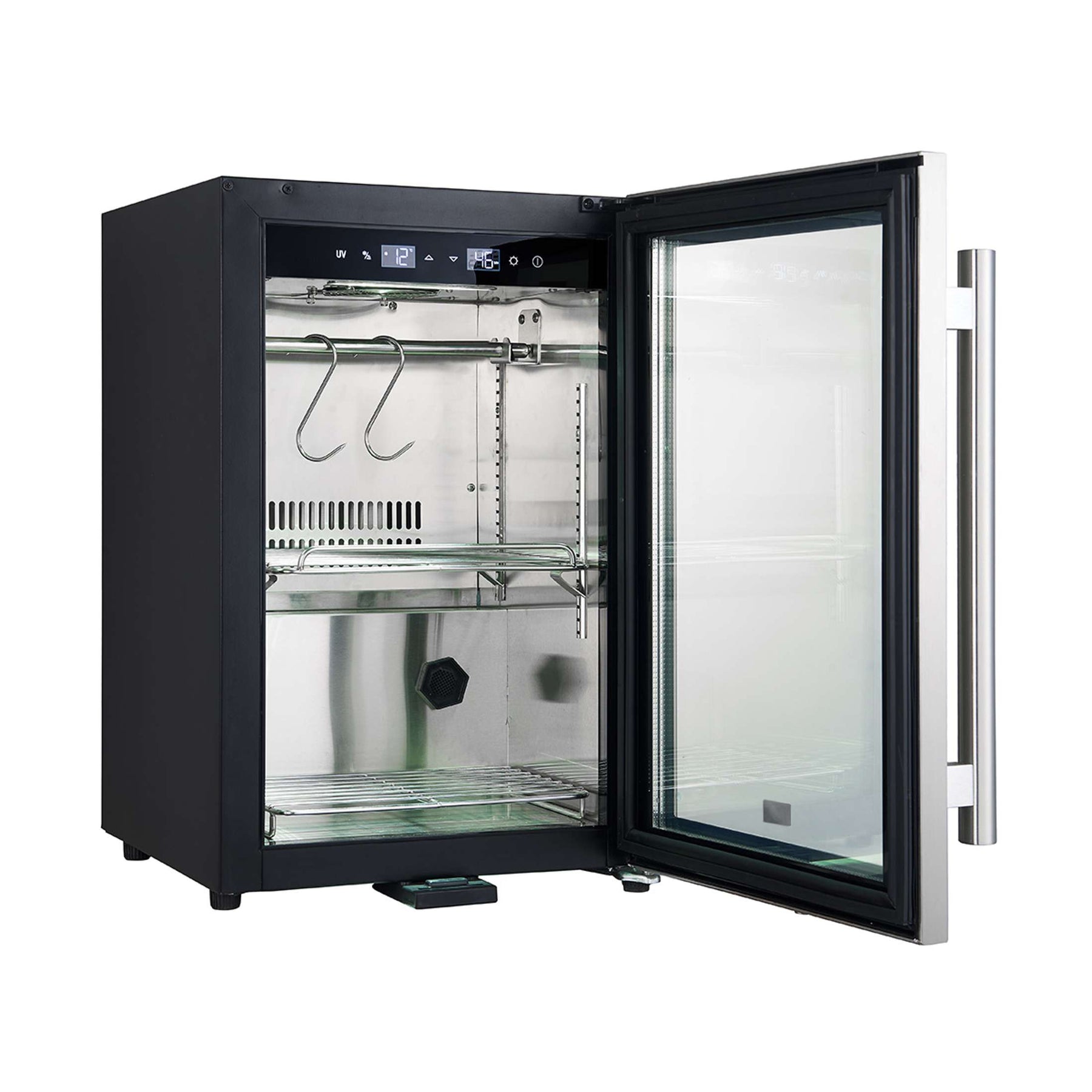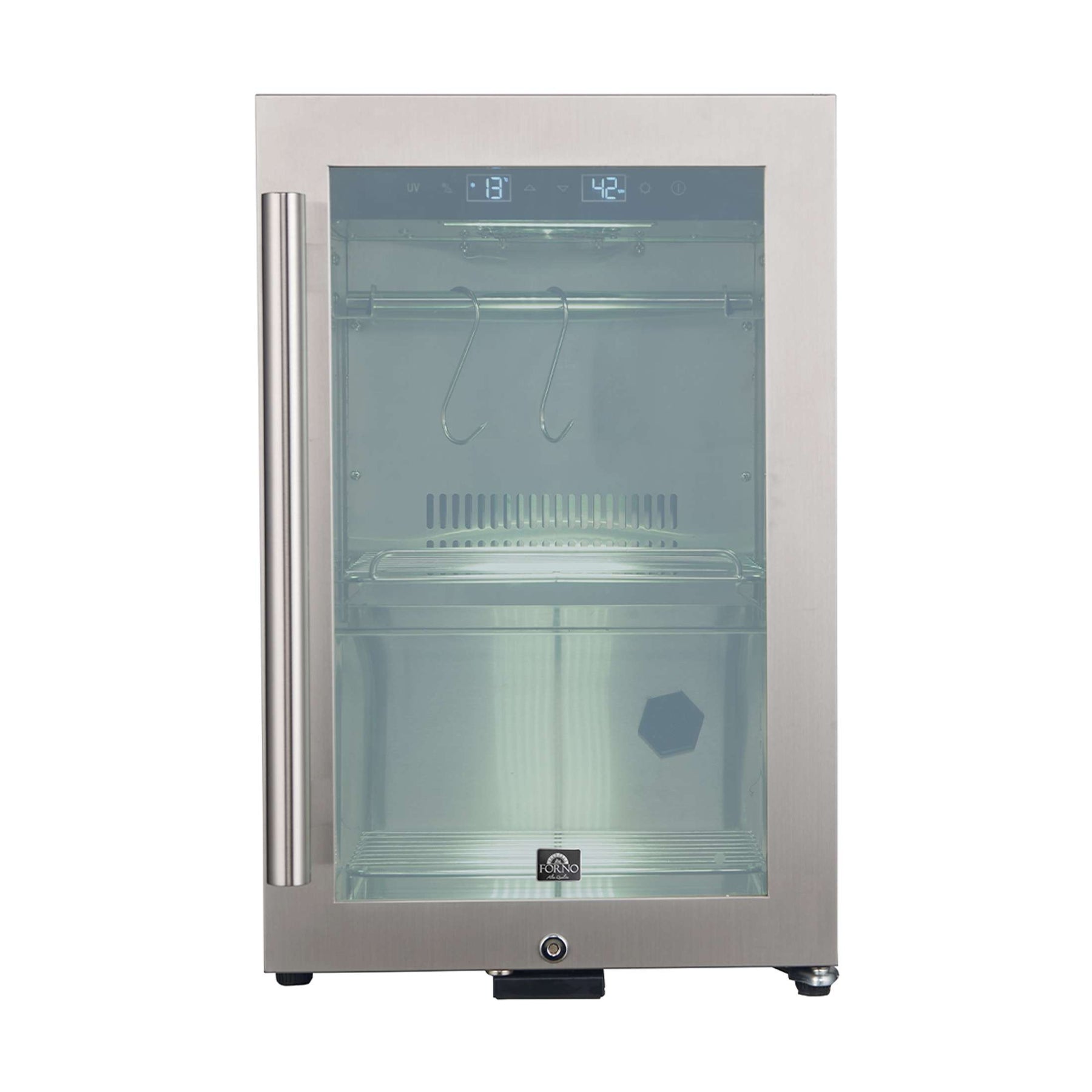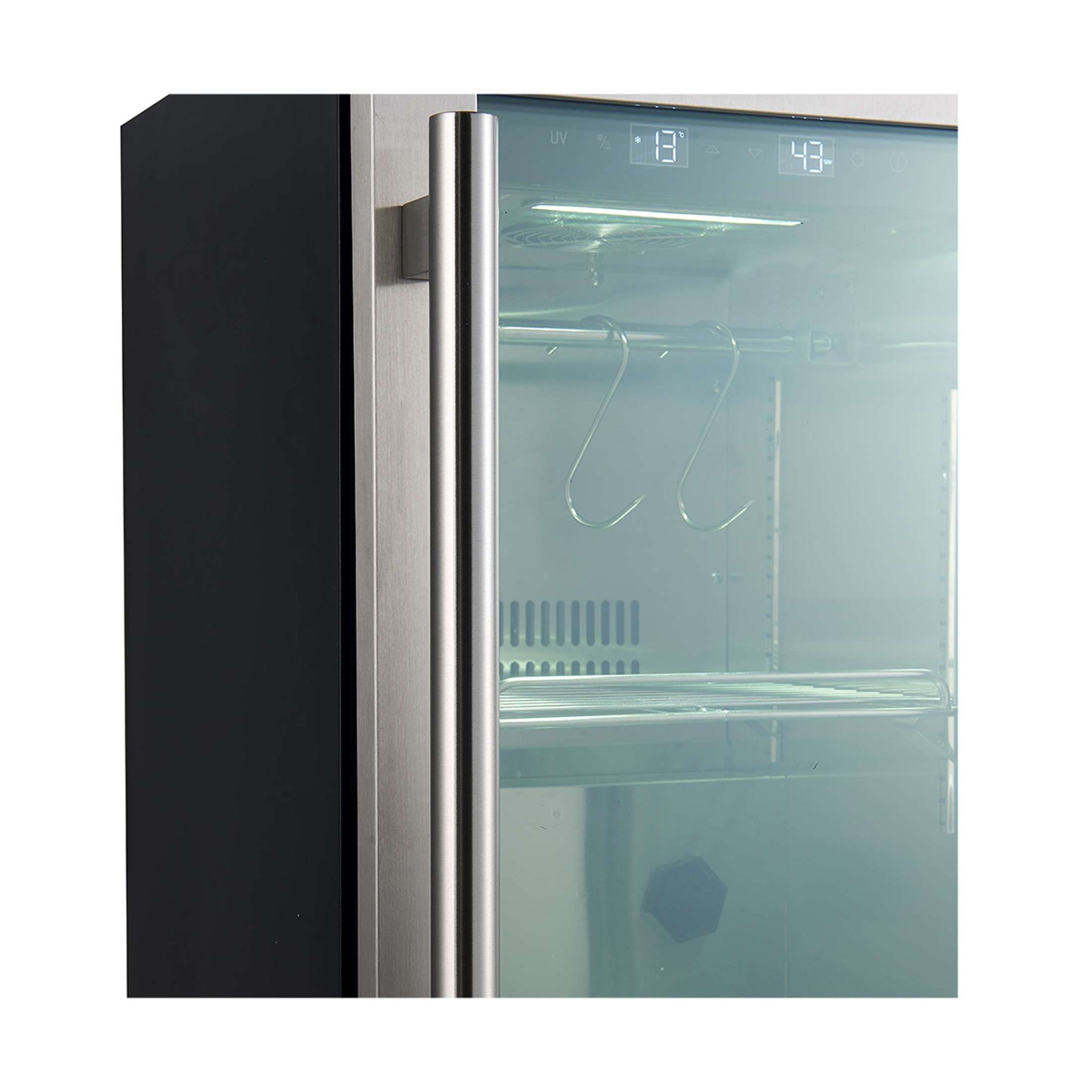 The Forno Asciutto 17" Dry Ager delivers precision aging with dual evaporators and airflow, ensuring consistent temperature and humidity control. The energy-efficient inverter compressor runs quietly while maintaining ideal conditions, while the automatic defrost system eliminates manual maintenance. UVC sterilization effectively eliminates bacteria, including resistant strains, while the charcoal filter neutralizes odors for a fresh interior. The UV-protected glass door prevents harmful light exposure, preserving meat quality. A spacious 1.84 cu. ft. stainless steel 304 interior provides long-lasting durability. Customize storage with three adjustable shelves, three sturdy hooks, and a dedicated hanger. The LED light strip enhances visibility, and the smart door alarm prevents temperature fluctuations, ensuring flawless aging results.
